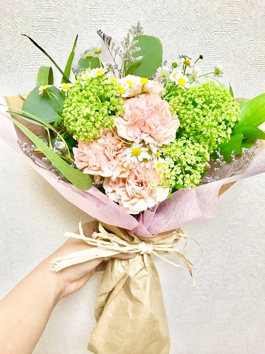 ※写真はいすずちゃんが作った花束のサンプルです。金額によってサイズや使う花の種類、大きさが変わります。一番金額が高いのは、頑張ってすっごく豪華にします!!