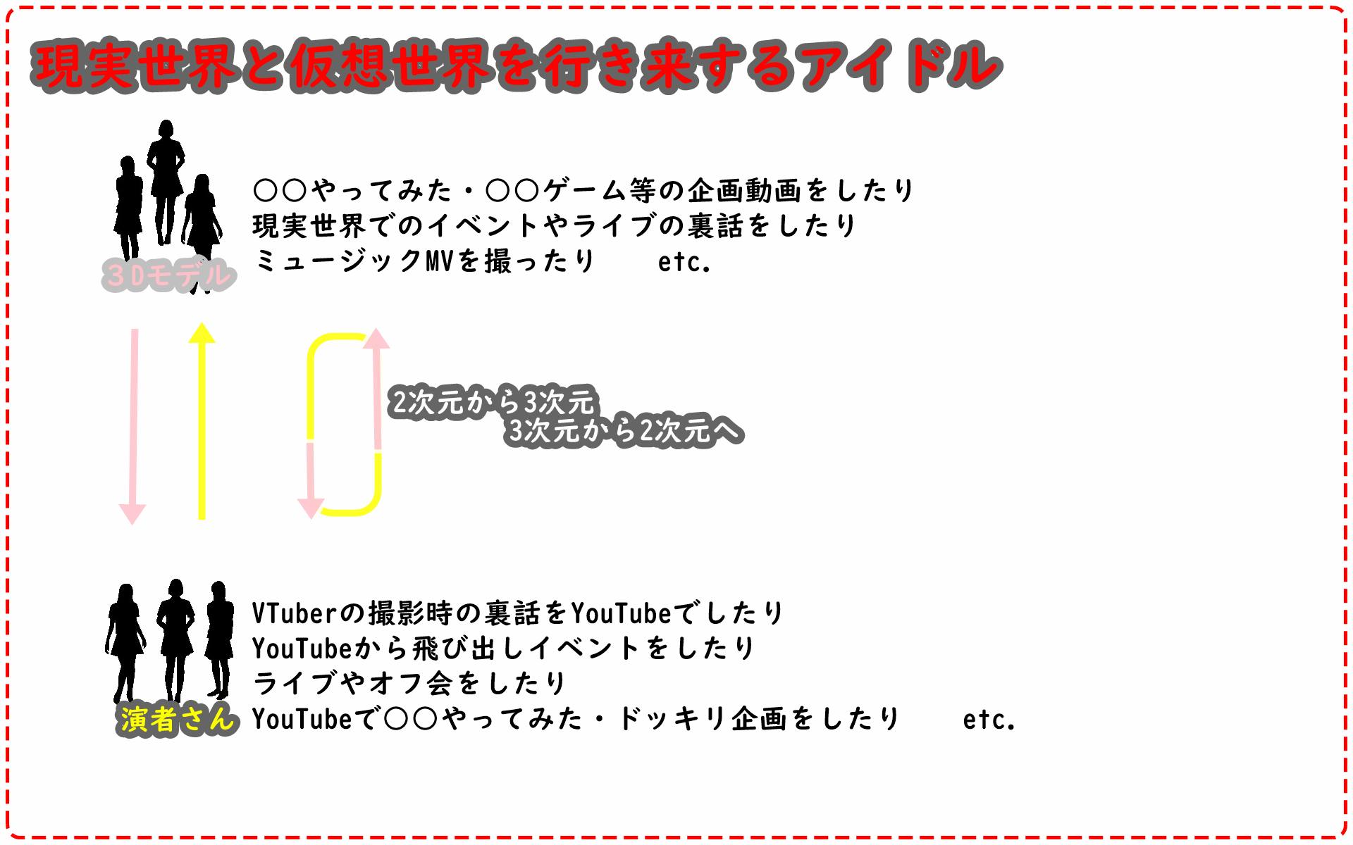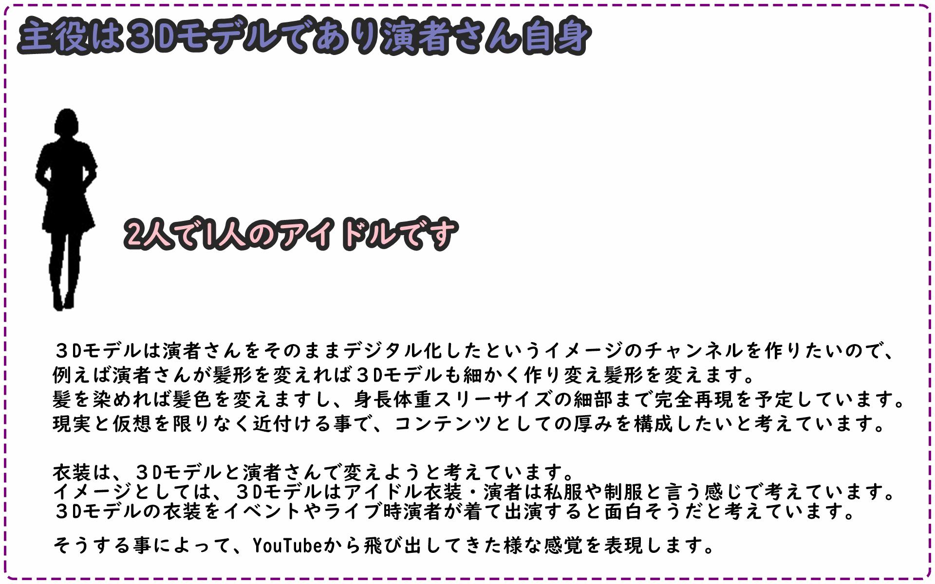 仮想空間だけに存在するアイドルとも、仮想世界に存在できないアイドルとも違う新感覚なアイドルプロジェクトが今回のプロジェクトの本質となります。