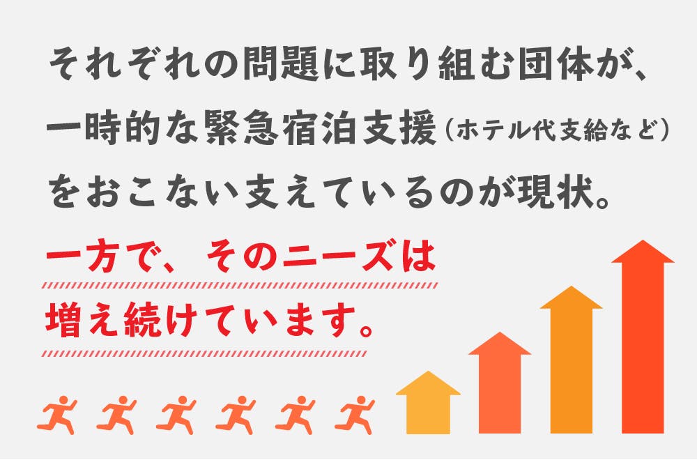 これらのSOSに対応するため、それぞれの分野で支援活動を続けている民間団体は、必要に応じてネットカフェやビジネスホテルの宿泊費の支給、無料で宿泊できるシェルターの提供などを行なっています。