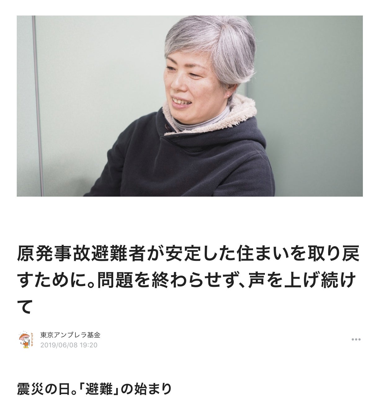 プロジェクトを応援いただきありがとうございます!東京アンブレラ基金事務局です。私たち「東京アンブレラ基金」で協働する各団体を紹介するインタビュー&レポートの第七弾を公開しました。今回は避難の協同センター 松本徳子さんです。■原発事故避難者が安定した住まいを取り戻すために。問題を終わらせず、声を上げ続けてhttps://note.mu/umbrellafund/n/na6414c6a8260◆ ◇ ◆◆ ◇ ◆◆ ◇ ◆■原発事故避難者が安定した住まいを取り戻すために。問題を終わらせず、声を上げ続けてhttps://note.mu/umbrellafund/n/na6414c6a8260