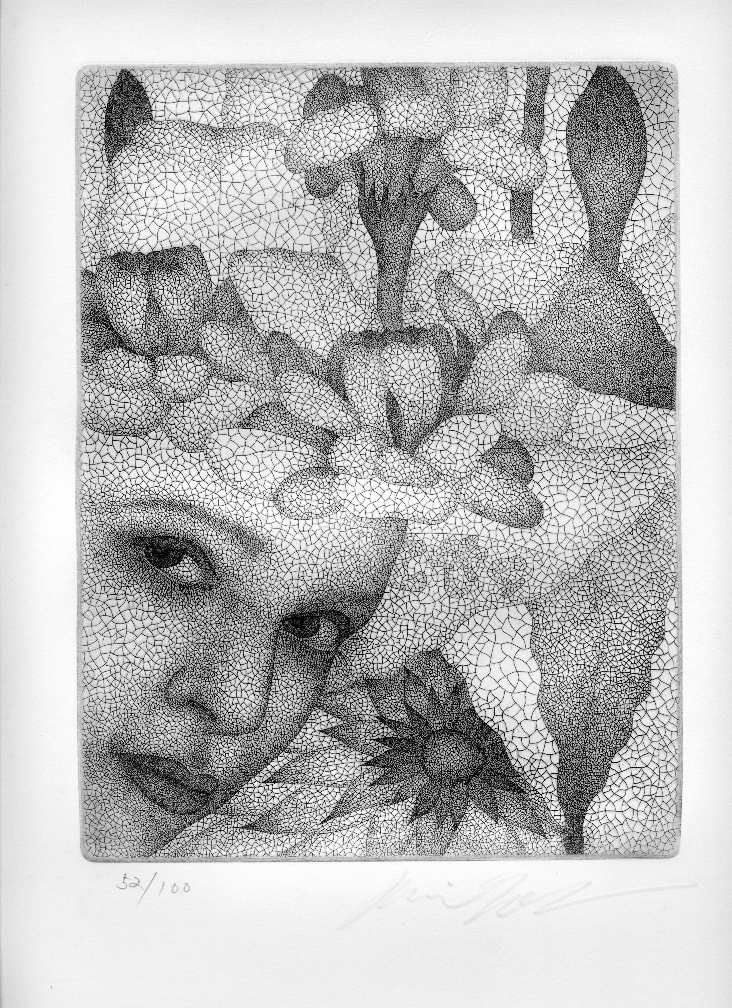 興味本位で後日、彼の展示会へ行ってみる。 そこには、信じられない光景が広がっていた。女性の身体に広がる葉脈 のような模様。銅版画とは思えない程、繊細で美しい線。官能的で詩的。一瞬で心を掴まれた。
