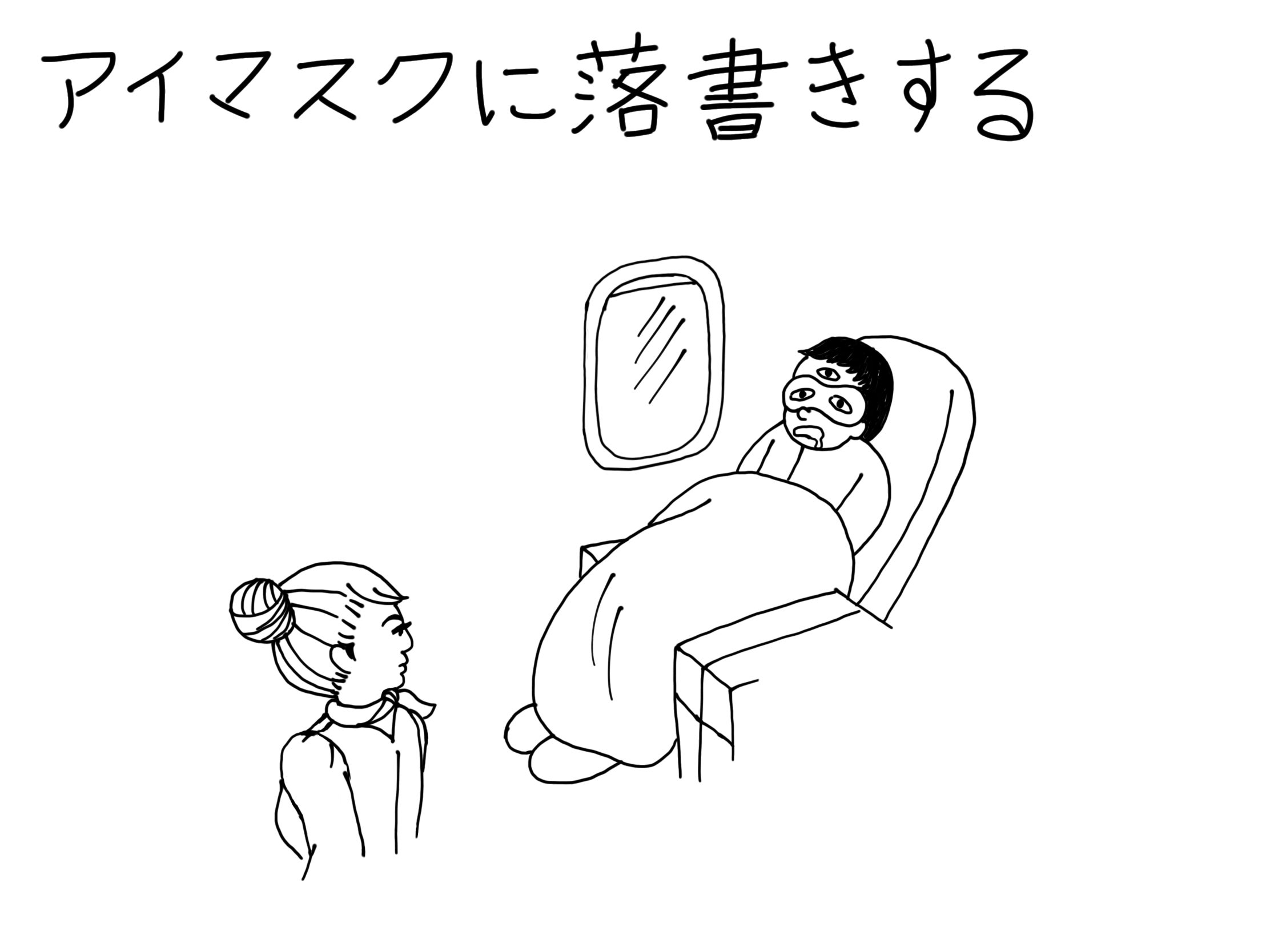 そこがプライベートな空間ではなくても、隣で眠っている友人は格好の獲物です。たとえば、新幹線や飛行機での長距離移動中。退屈な時間を彩るにはペン一本あれば十分。覚醒した両の眼を描くのが一般的ですが、そこはひと工夫。機上だったら、CAさんに向けてウインクする瞳でも描いて笑いを誘いましょう。