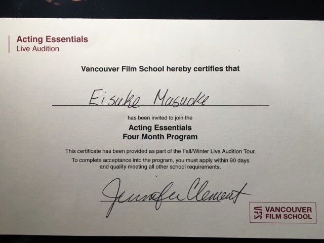 学校の先生から紹介されたことがきっかけで、バンクーバーの映画学校、「Vancouver Film School 」のオーディションに参加。見事合格。