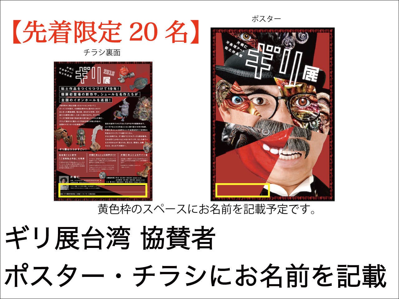 あなたも協賛者になりませんか?台湾には行けないけど、何らかの形で参加したいという方も多いのではないでしょうか。それを叶えるこのリターン。なんとギリ展のポスターとチラシにあなたの名前が!友達に自慢できちゃうかも♫