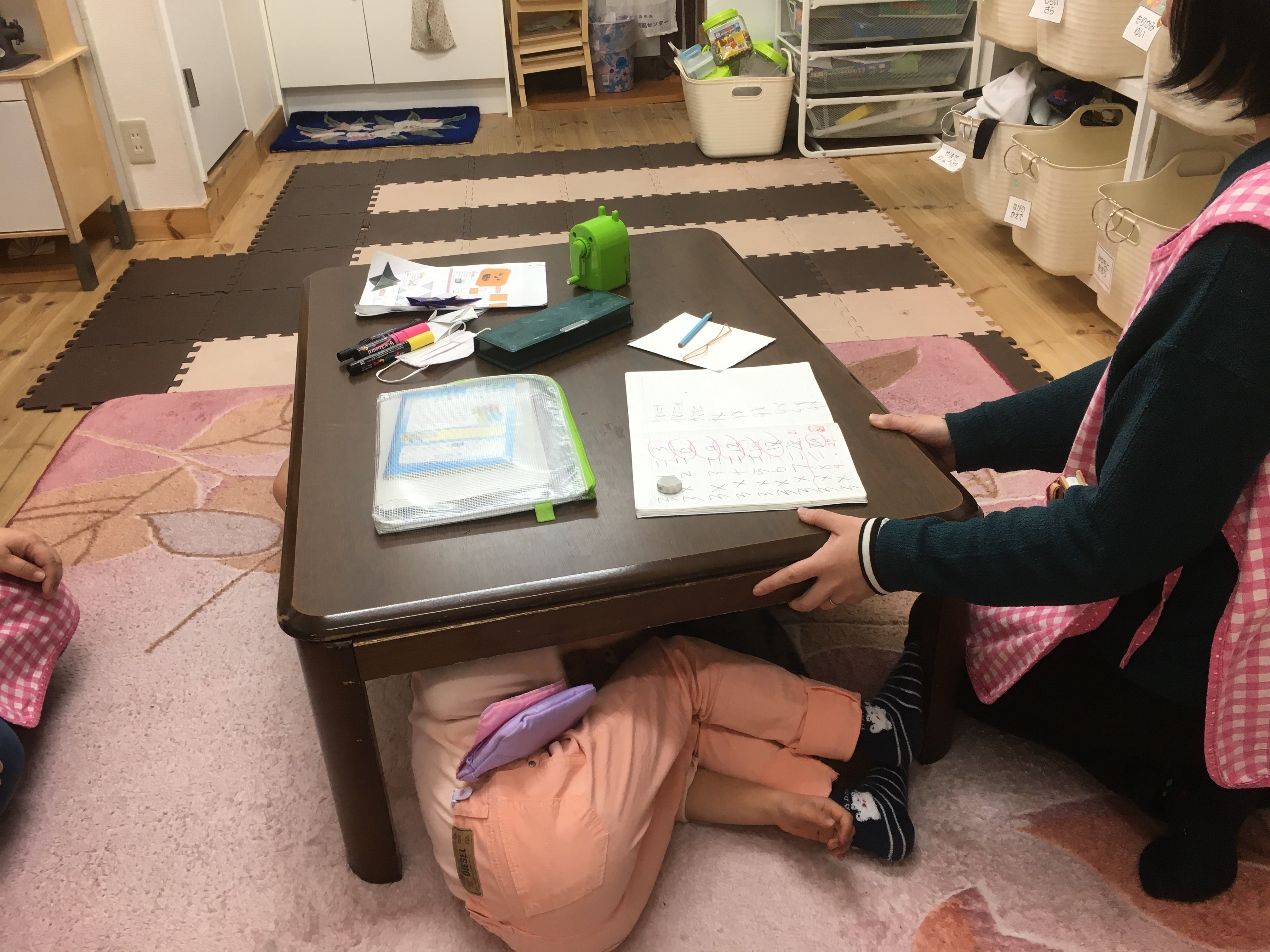 宿題の途中ですが、急いで机の下に隠れます。