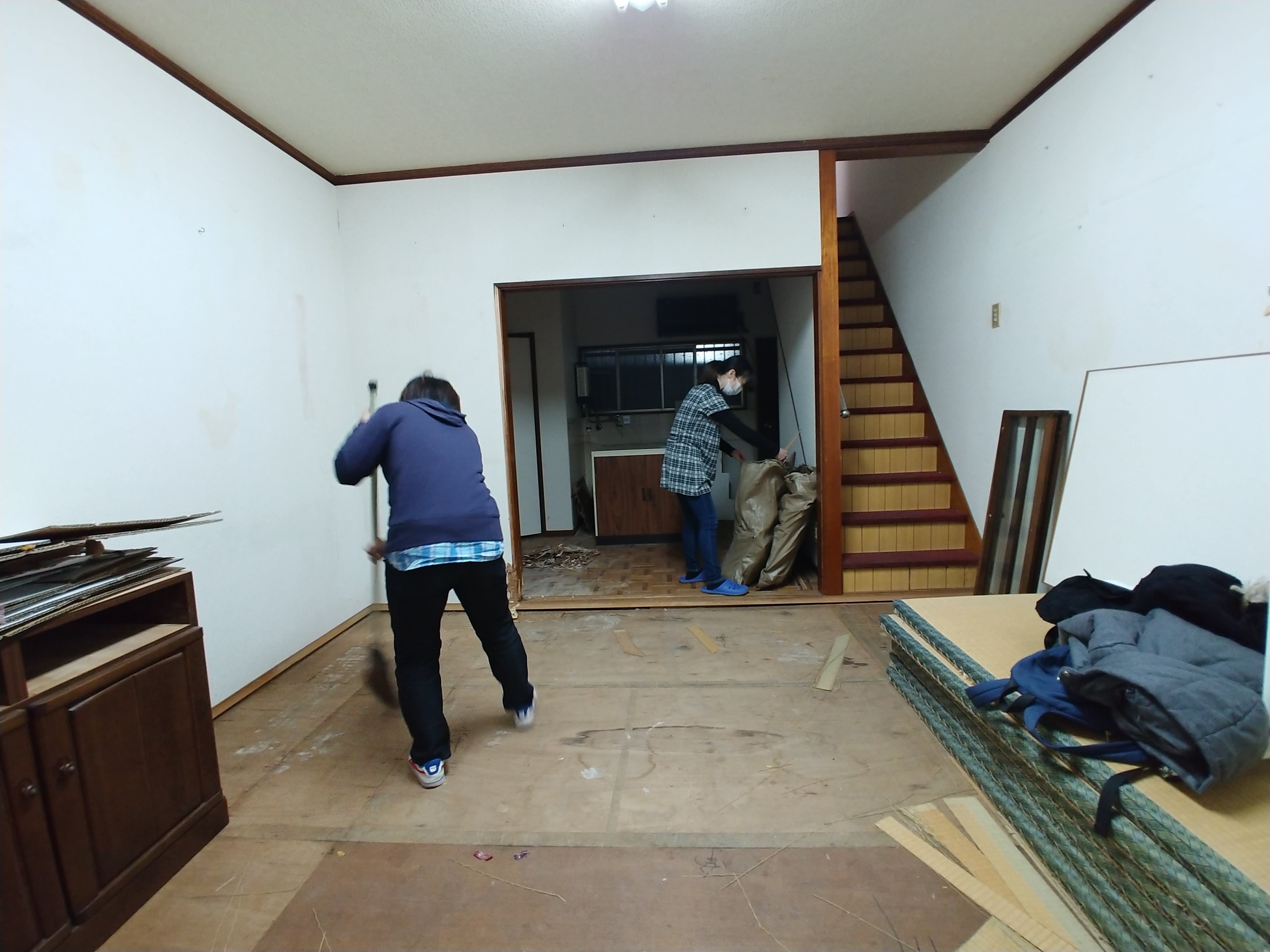 奥のキッチンだったスペースと手前側を区切っていた白い壁を解体したもらうことになり掃除中です♪壁を取り払うとどんな雰囲気になるのかワクワクしてます♪