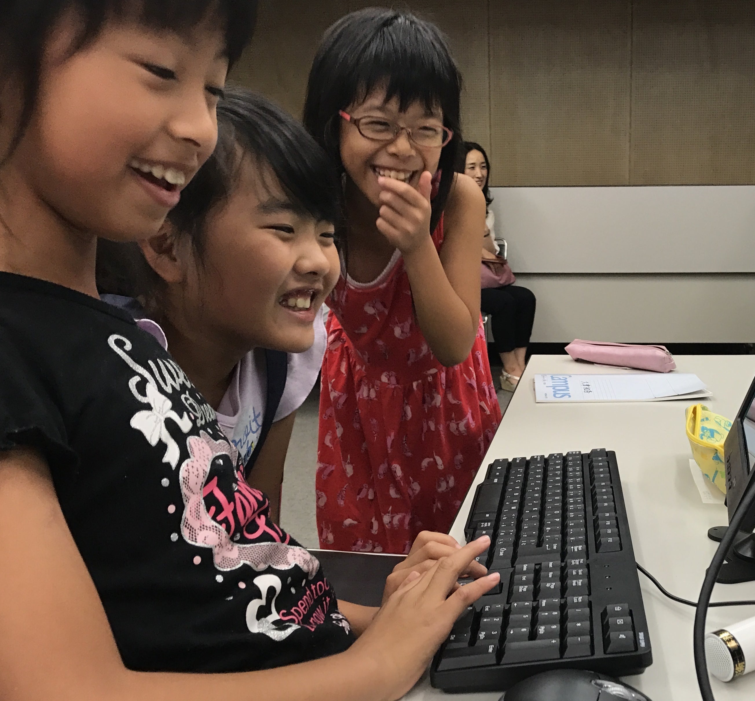 ・「プログラミング体験教室〜自分が作ったゲームを動かしてみよう〜」(講師 畠山環境技術士事務所所長/畠山義彦先生)(下写真:自分でプログラミングしたゲームを動かしてみて、笑っているところ)