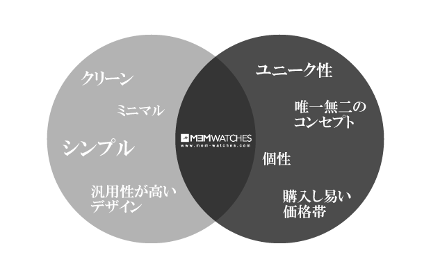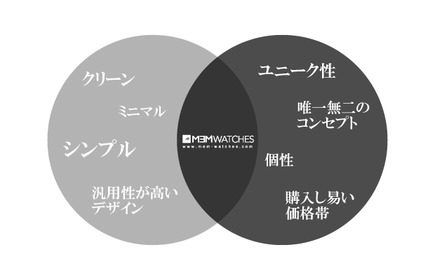 他のメーカーには無いコンセプト、デザイン、価格帯がMEM WATCHESの特徴です。