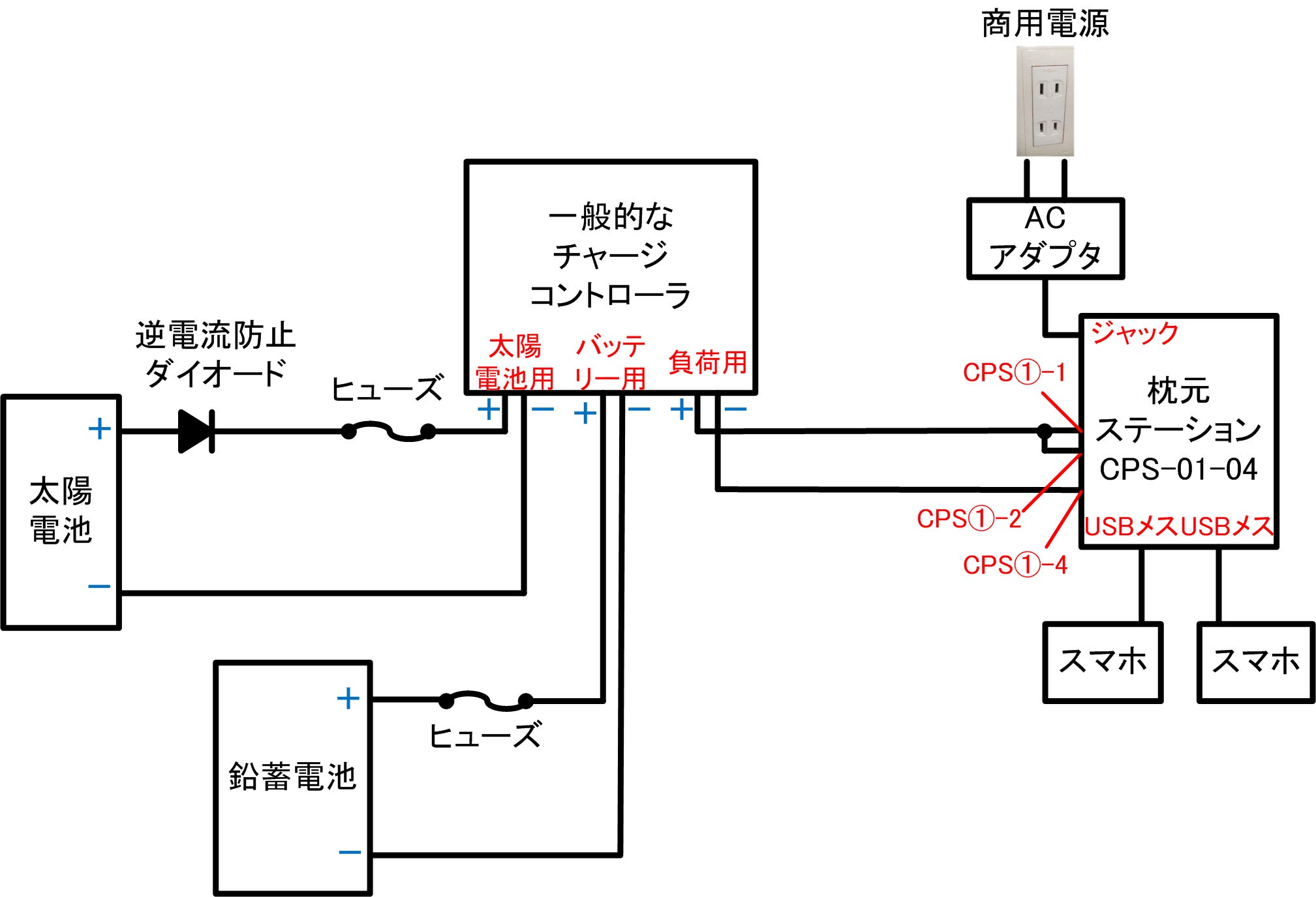 太陽電池には、+側に、太陽電池からチャージコントローラに電流が流れる向きに逆電流防止ダイオードを取り付けます。太陽電池&逆電流防止ダイオードの+側を太陽電池用端子+に、-側を太陽電池用端子ーに取り付けます。鉛蓄電池も+側をバッテリー用端子+に、-側をバッテリー用端子ーに取り付けます。一般的なチャージコントローラと枕元ステーションCPS-01-04の接続は、負荷用端子+とCPS①-1、CPS①-1とCPS①-2、負荷用端子-とCPS①-4を接続します。ジャックにはACアダプタを、USBメスにはスマホ等へ充電するためのUSBケーブルを接続します。