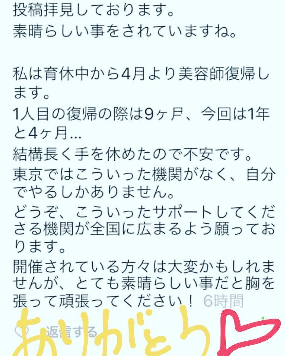 SNSに寄せられたママ美容師さんからの活動への応援メッセージ