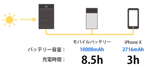 実際の発電テストでは、iPhoneXを満充電するのに3時間で完了しています。10000mAhのモバイルバッテリーは8.5時間です。