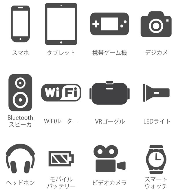 スマホやモバイルバッテリーだけでなく、上記のようなものが充電可能です!ようはUSB充電できるものならなんでもOKです。
