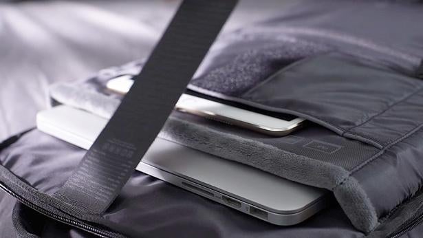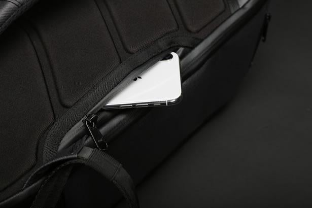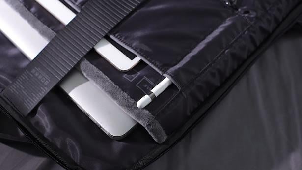 さらに抜群のガジェット収納力。15.6インチまでのPCと10.1インチまでのタブレット収納、スキミング対策済のシークレットポケット装備。さらにペットボトル収納が可能な外部サイドポケットまでついています。