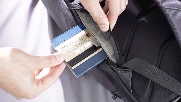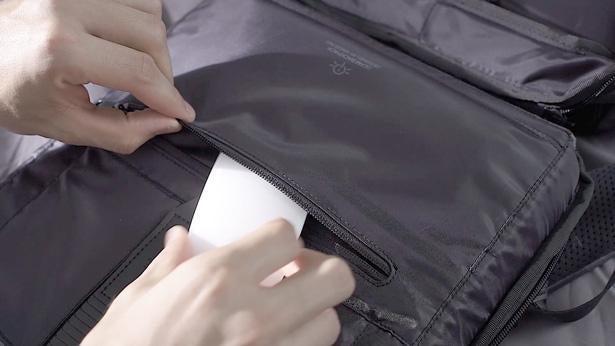 バックパック背面にはシークレットポケットが2つあります。右シークレットポケットはRFIDブロック(スキミング対策)機能付きで、クレジットカードやパスポート等の貴重品の収納にぴったりです。