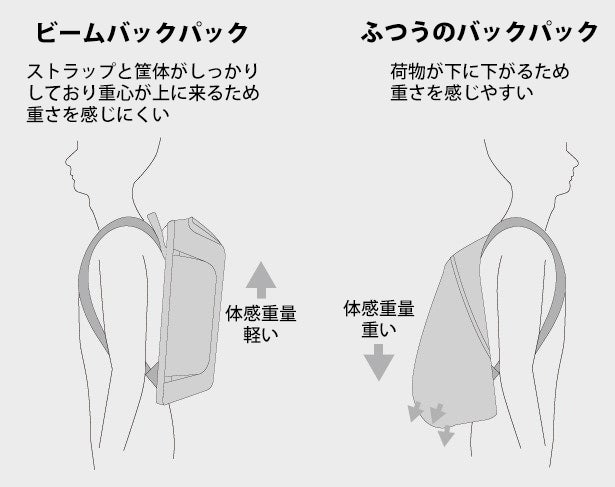 ビームバックパックは外殻がしっかりしているため、ふつうのバックパックと比べ重心が上に行くようになっています。このため体感的に重さを感じにくい構造になっています。