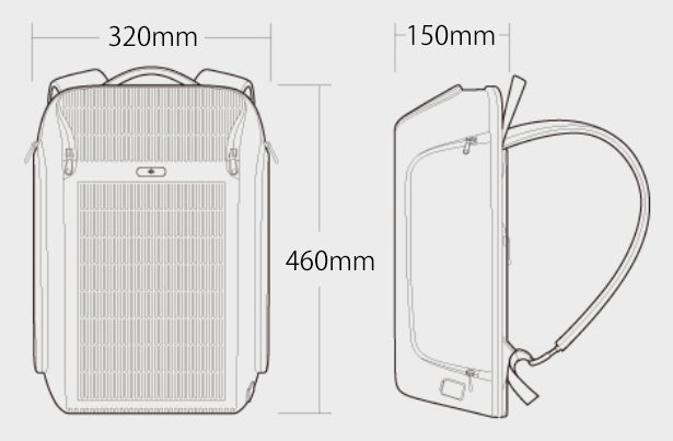 ソーラーパネルとバックパック本体が一体となった、流麗かつサイバーな雰囲気を漂わせた近未来的なルックス。他のソーラーパネルをとって付けたようなダサいバックパックとは一線を画します。