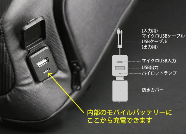 ▼外部USBコネクタ(バックパック外部右下に装備)