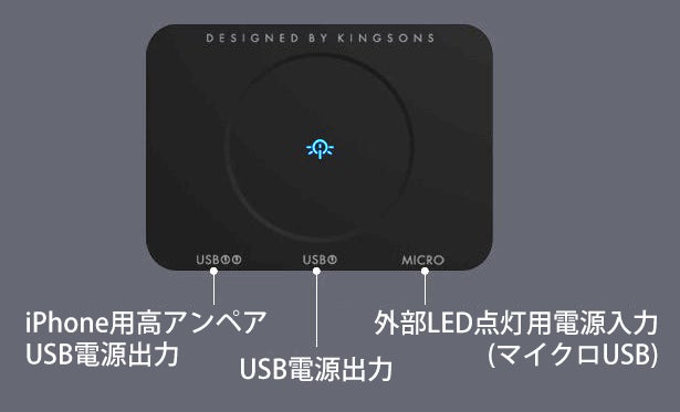 内部電源供給システム:スマートリブート機能付き、iPhone用高アンペアUSB電源出力x1、USB電源出力x1、LED点灯用マイクロUSB電源入力x1