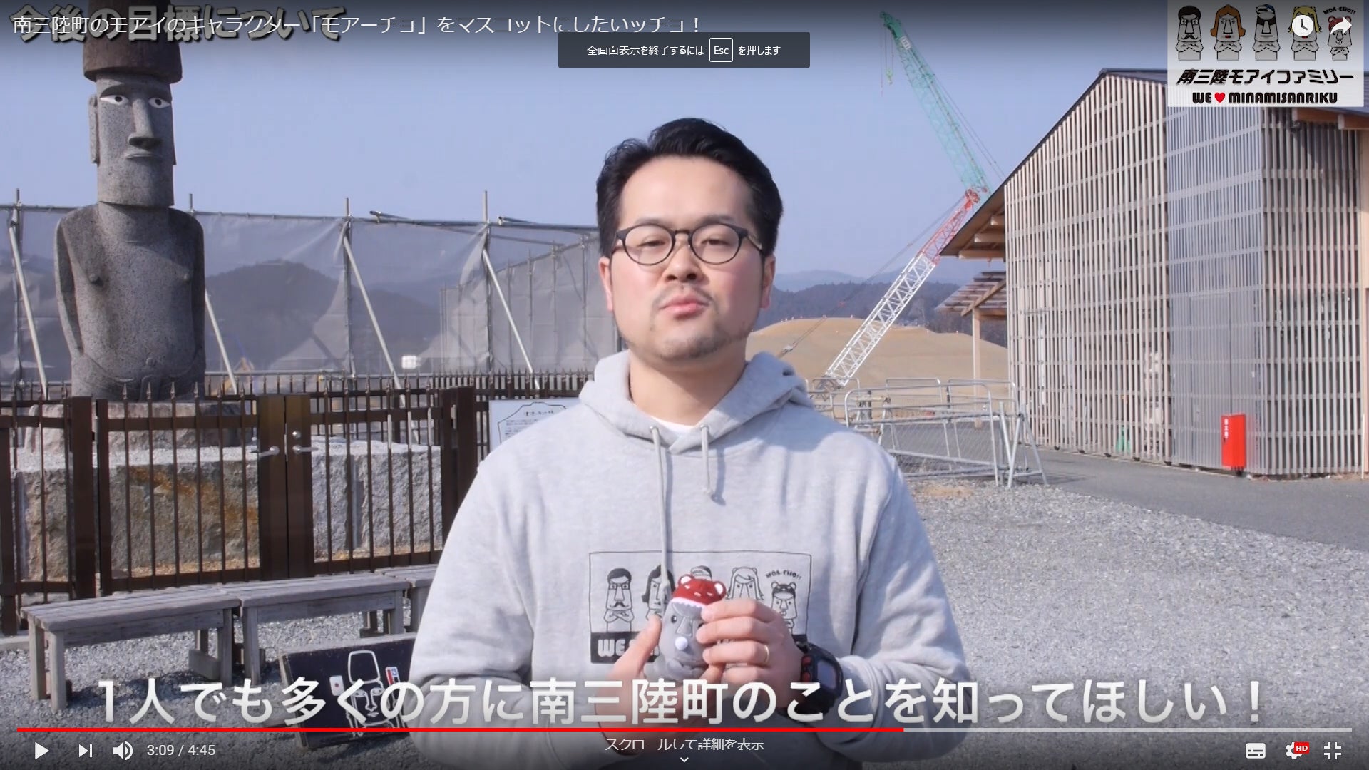 ※動画は記事中段よりご覧いただけます皆様、こんにちは!!南三陸モアイファミリーの柳井です。モアーチョのクラウドファンディングが始まり、はや2週間が経とうとしております。一昨日3月11日は、東日本震災復興から8年目を迎えました。CAMPFIREのサイト内でも復興に関連するプロジェクトをフューチャーしていただき、本プロジェクトも多く方に知っていただくことができました。そして、毎日ちょっとずつではありますが、パトロンになってくれる方が増えております。何よりも嬉しいことは、パトロンの皆様から届くメッセージ。クラウドファンディング自体初めての取り組みで、不安も多いのですが、温かいメッセージをいただくと本当に励みになります。とはいえ、まだまだこれから!!目標達成まで、引き続きよろしくお願いいたしますm┃━┏┃mさて、そんなモアーチョのクラウドファンディングについて募集の経緯や想いを少しでも伝えたいなと思い、この度プロモーション動画を作りました!すでに募集ページ内には掲載しておりますが、活動報告としてもご報告さえて頂きます。5分弱の短い動画ですが、モアイファミリー代表の柳井がプロジェクトにかける想いを語っております。カメラ慣れしていないので、もうガッチガッチですが…(^-^;そこはご愛敬としてご容赦ください(笑)それではどうぞ!!↓↓↓★南三陸町のモアイのキャラクター「モアーチョ」をマスコットにしたいッチョ★【動画裏の話】ちなみに…たっ5分程度の動画なので、撮影に2日かかってます。。。1日目に撮影した動画はあまりにもひどすぎて…2日目までかかってしまったという(汗)動画って難しいんですね(^-^;何度も撮影と編集にご対応いただいたカメラマンの三浦様には、この場を借りて深く感謝いたします。以上、プロモーション動画掲載についてのお知らせでした。引き続き、モアーチョのクラウドファンディングをよろしくお願いいたします。南三陸モアイファミリー柳井PSあ、動画に関する感想などありましたら、遠慮なくお知らせください。「どっちがモアイ像なんですか?」とか「顔がモアイに似てますね」とかどんなメッセージでもお待ちしてます!!