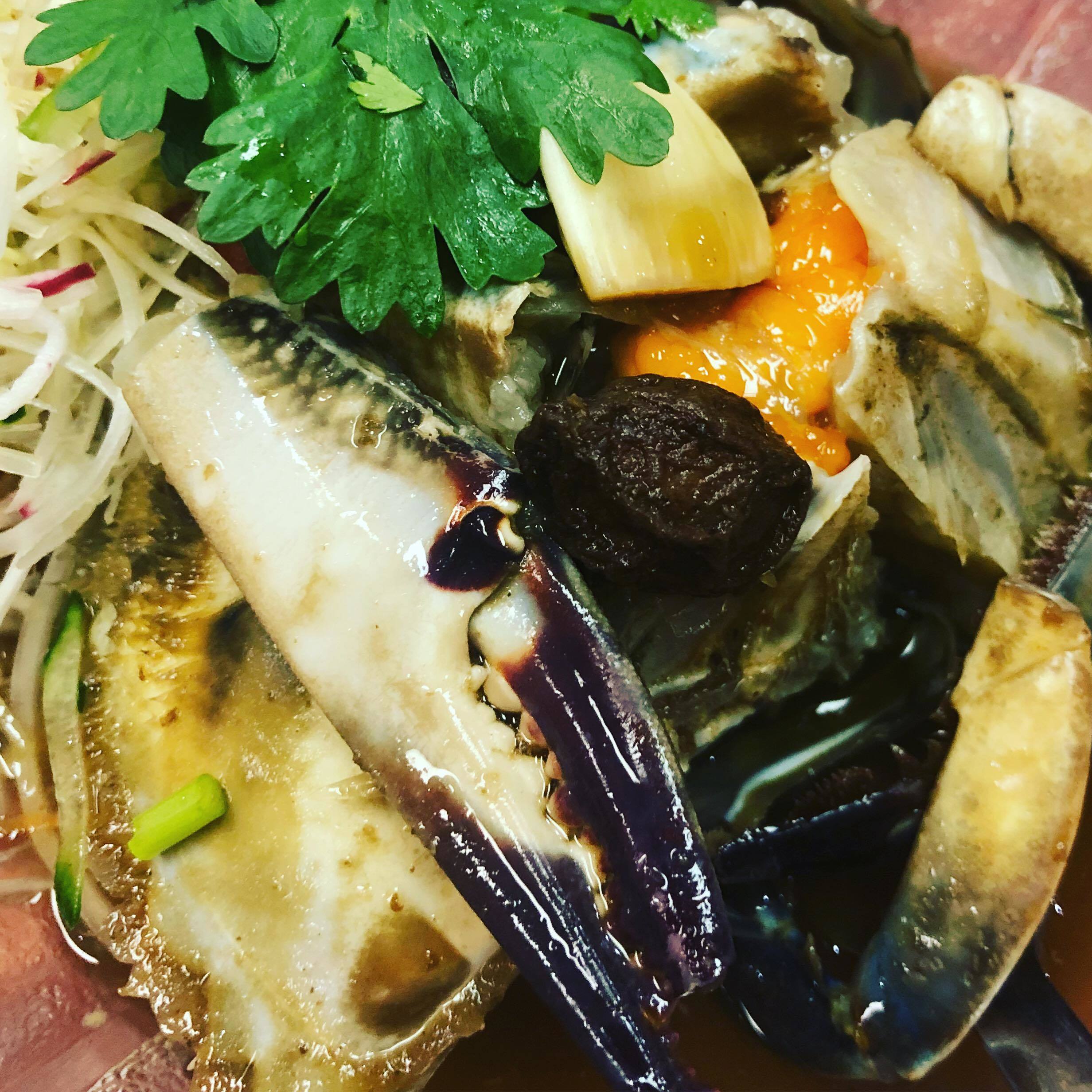 鮮度の高いワタリ蟹を生きたまま紹興酒、梅、白酒、薬膳素材で10日間漬け込み、白髪葱と一緒にご賞味ください。特に雌の卵入りの美味しさは驚かれると思います。