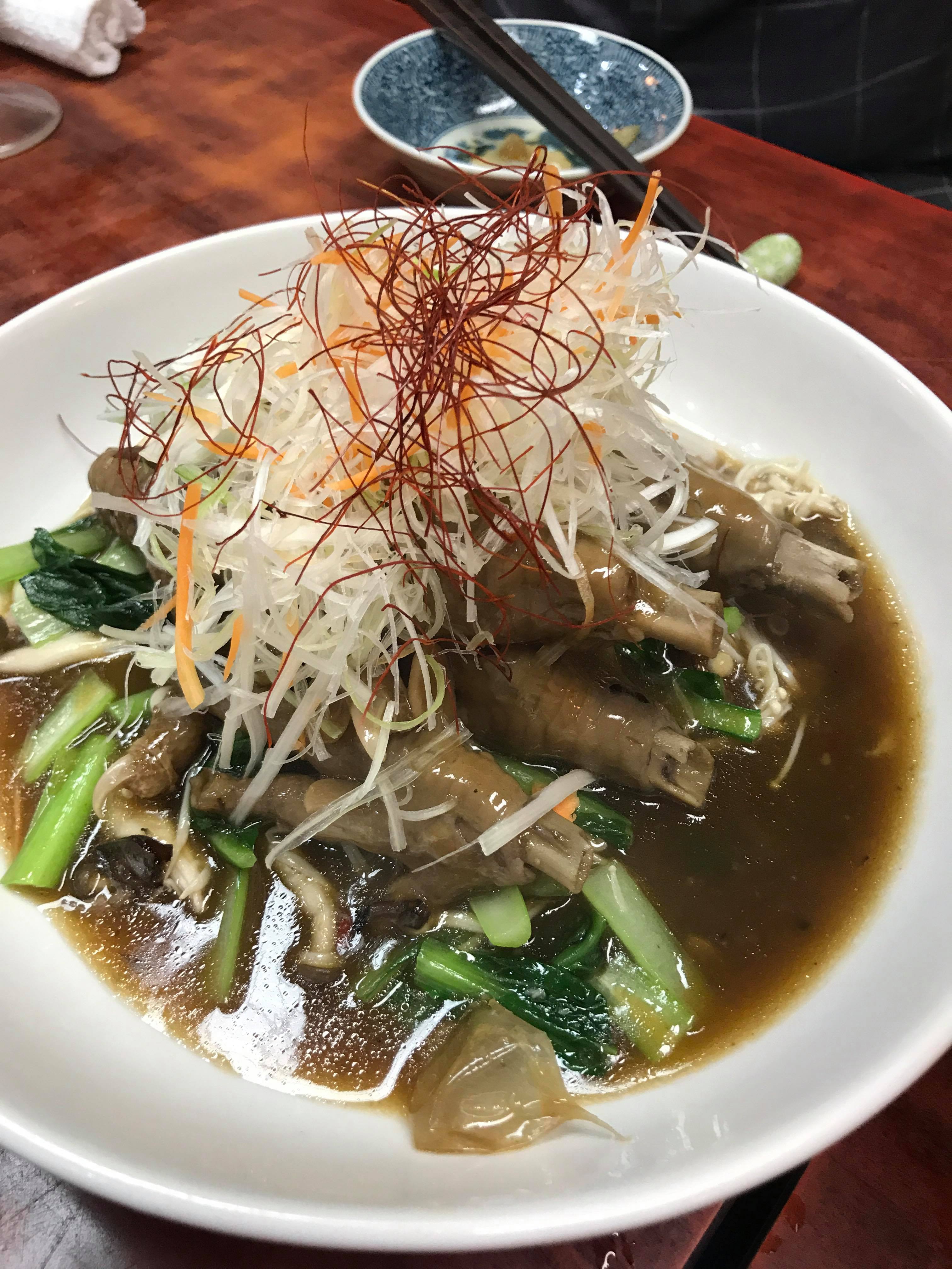 鳥の紅葉(脚の部分)と黒豆と青梗菜の炒めに白髪葱を添えてお出しします。