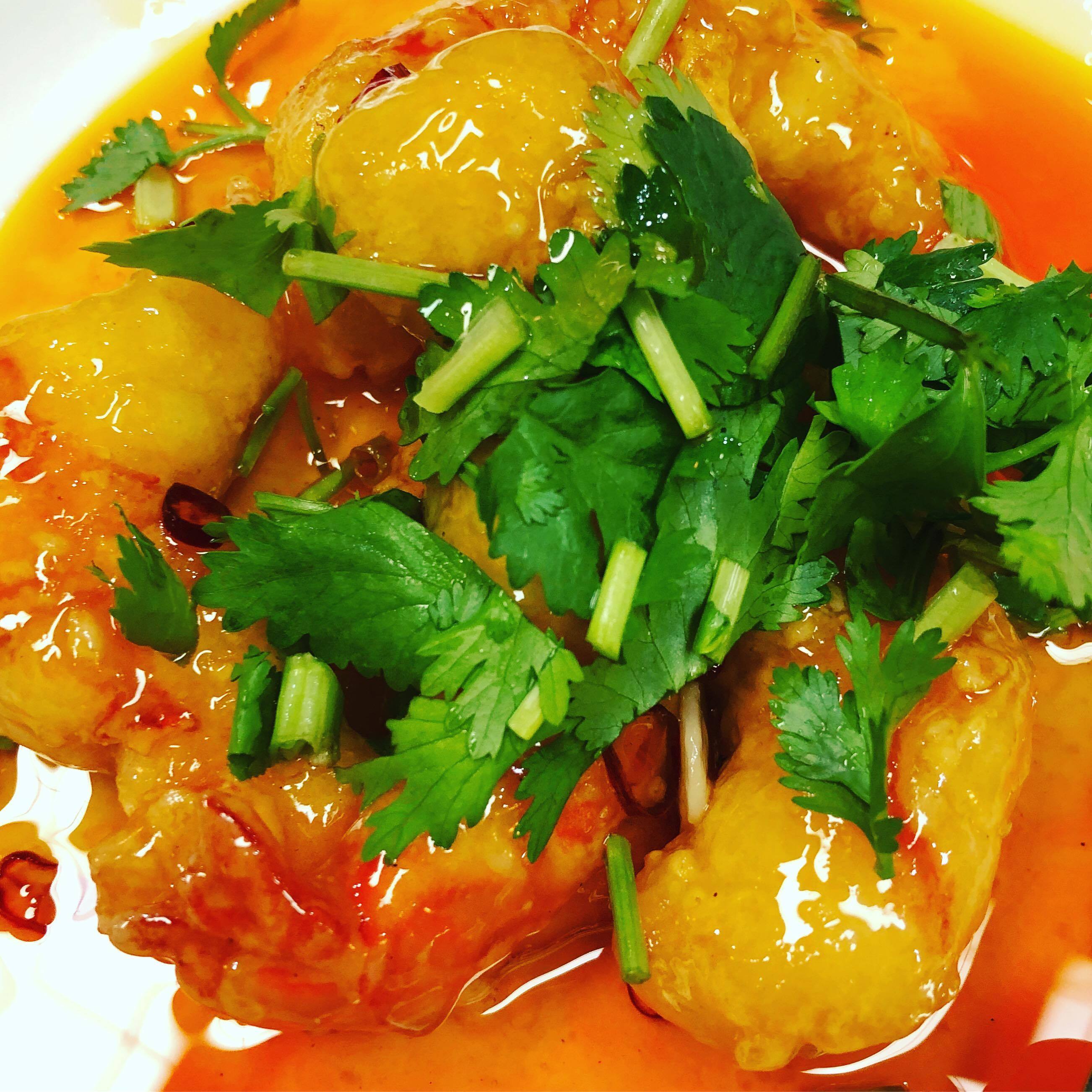 日本式の天ぷらとの違いは、日本の場合は天つゆにつけるとシャキシャキ感が失われがちですが、当店の調理方法では海老のシャキシャキ感を失わず、魚醤を使ってピリ辛に仕上げてご提供しております。