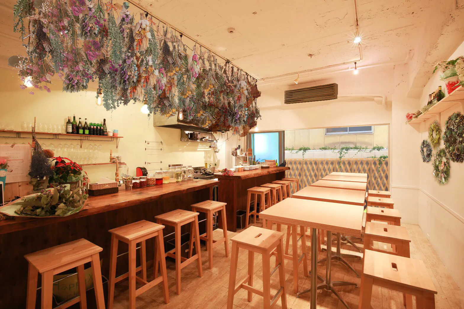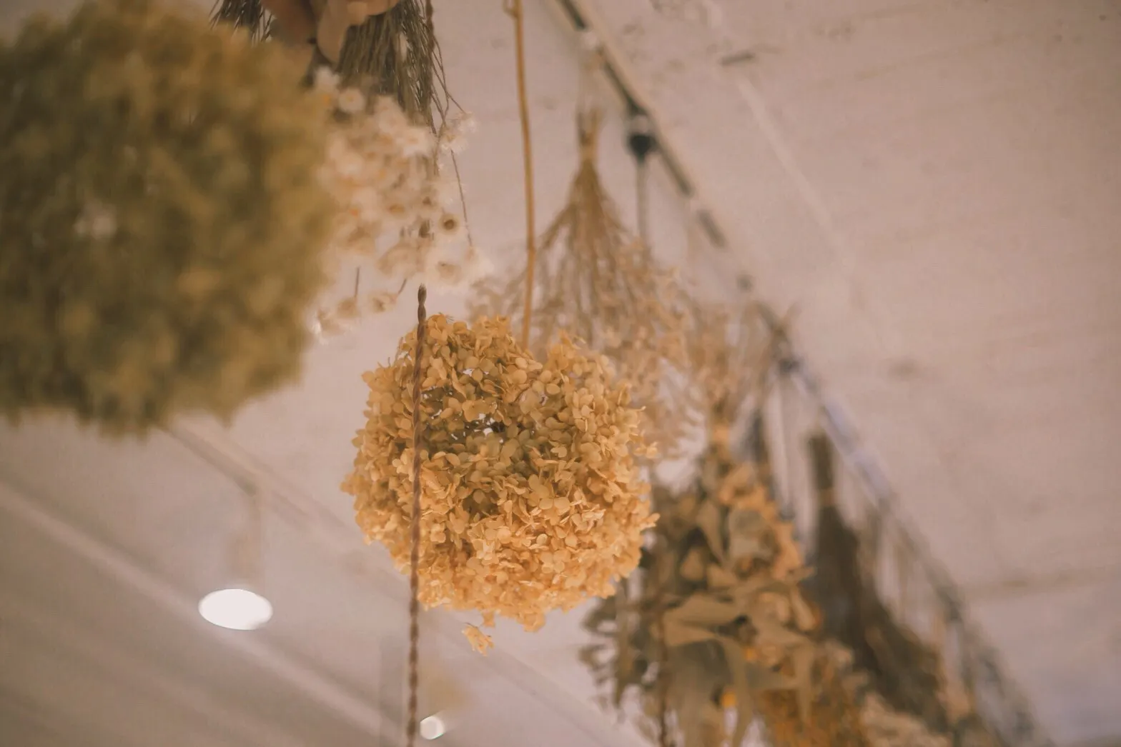 こちらは、カフェ内のカウンター上にぶらさげているお花です。カウンターの上に吊るしているブリザーブドフラワーを増やしてボリュームをだせたらいいなと考えています!