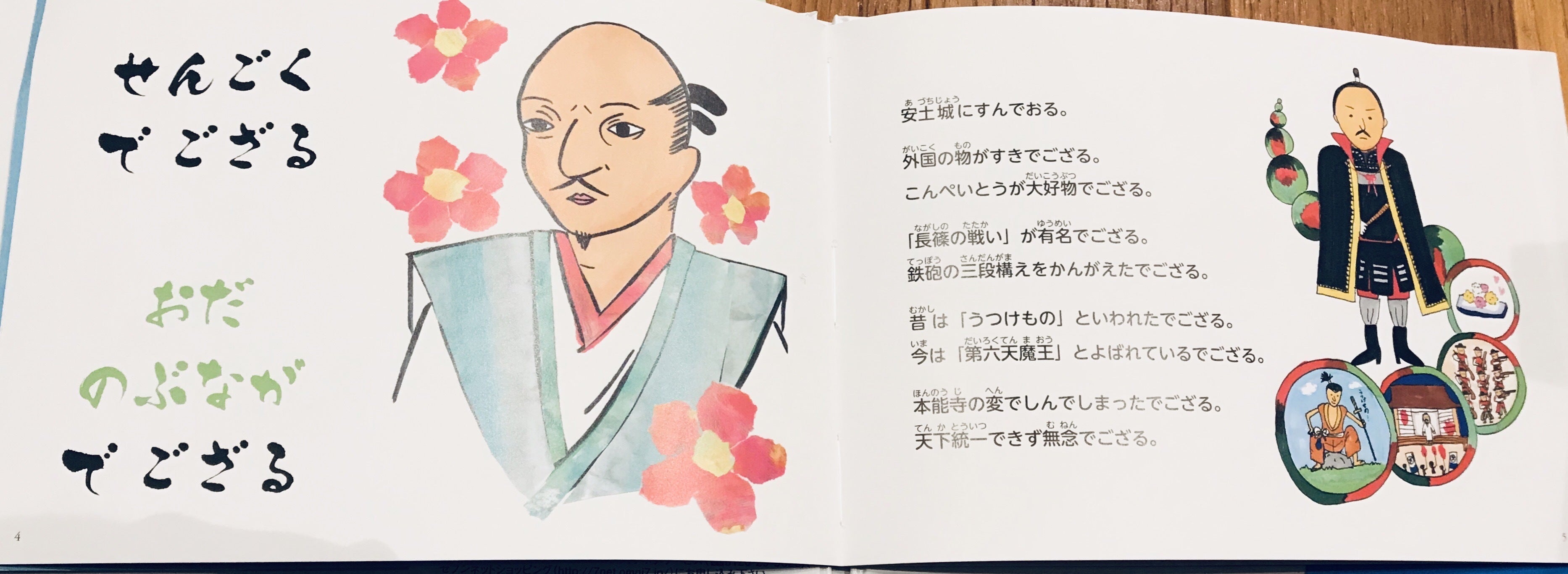 「せんごくでござる◯◯でござる」といった耳に残りやすいリズムで6人の武将について描いています。1人見開き2ページずつの紹介です。教科書に載っているようなことだけでなく、好きな食べ物やあだ名、面白エピソード等も記載してあります。小さなお子様へは読み聞かせがメインですので、大人が読みやすいように漢字を使用していますが、就学前のお子様が読めるようにルビを振っています。