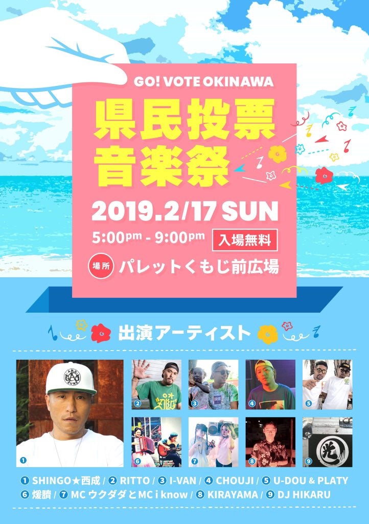 県民投票の投開票日一週間前の 2月17日(日)、沖縄・那覇市の国際通り入り口にある、パレットくもじ前にて「県民投票音楽祭〜Beyond the Border」というイベントを開催します。「乗り越える」をテーマに、ミュージシャン&DJによるライブだけでなく、県民投票や基地について語り合うトークセッションや、会場で旗を作り上げていく企画、「けんみんとうひょう」でそれぞれのおもい・歌詞をつなぐ企画(あいうえお作文風)などさまざまな催しがパレットくもじ前広場で展開されます(2月11日現在、21日に石垣島、22日に宮古島でも同様のイベント開催を予定しています)。