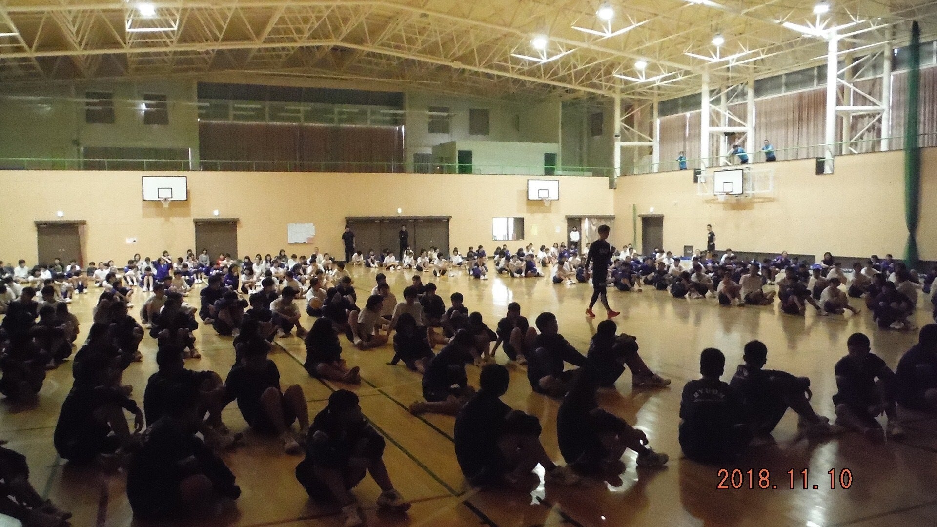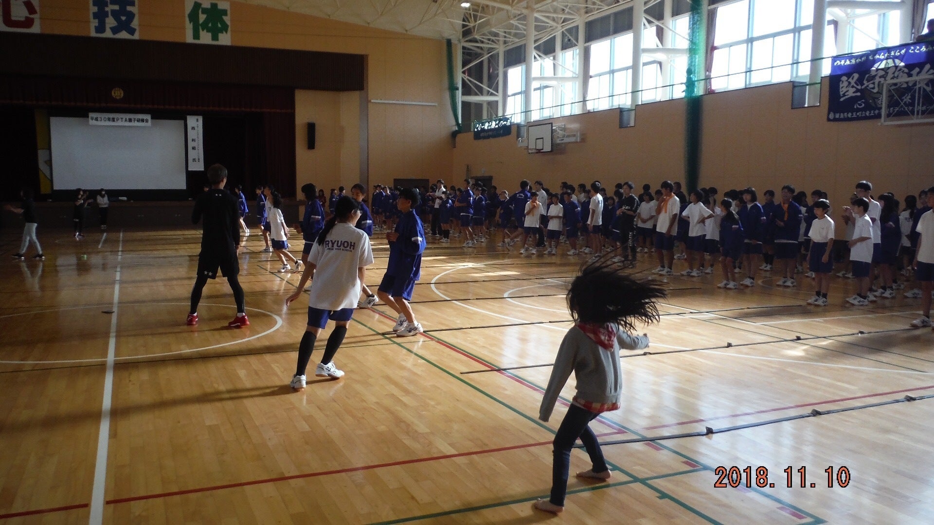 実績・中学校1年生から3年生、教員、保護者総勢350名で中学校体育館で約2時間、講演とリズムトレーニング体験。