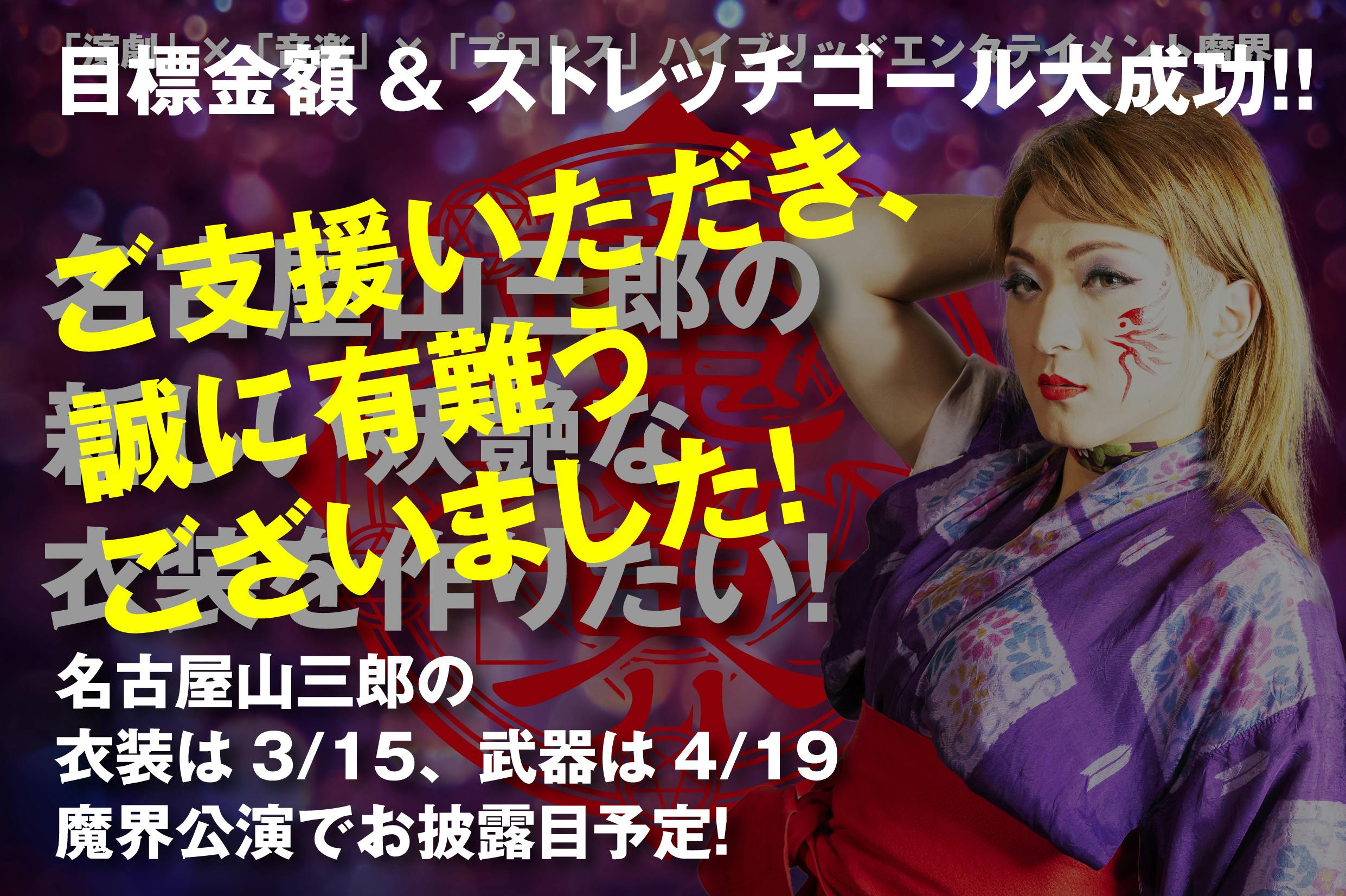2019/02/28 12:01魔界クラウドファンディングプロジェクト【魔界】名古屋山三郎の新しい妖艶な衣装を作りたい!皆さまのご支援のおかげで目標金額&ストレッチゴールを達成いたしました!ご支援くださった皆さま、本当に有難うございました!ストレッチゴールも達成しましたので、名古屋山三郎の武器も制作いたします!名古屋山三郎の衣装は3月15日魔界公演にて、武器は4月19日魔界公演にてお披露目予定!是非当日会場で目撃してください!第57回魔界〜原罪 Original sin3/15新木場魔界アリーナにて!!!チケット好評発売中!★公演チケット予約は カンフェティ★メールでのご予約は ticket.senkusha@gmail.com魔界公式HP https://www.makaisyojyoken.com/ もっと見る