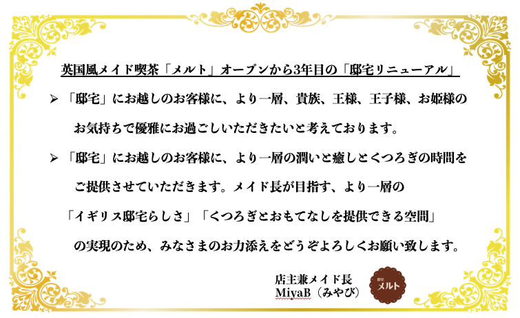 改めまして、皆様ごきげんよう。喫茶メルトの店主でメイド長のMiyaB(みやび)と申します。