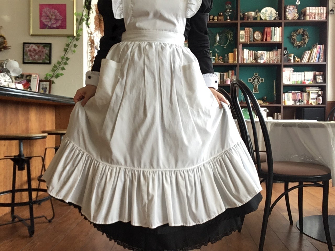 イギリスのアフタヌーンティーの文化への憧れから、イギリスのクラシカルなメイド姿でお客様をお迎えして給仕、おもてなしさせていただております。