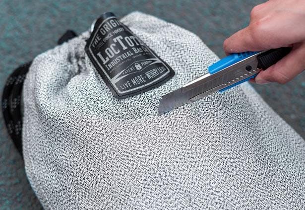いくらがっちりロックしても、袋ごと切られたら意味がありません。Flak Sack SPORTの素材はANSI(American National Standards Institute:米国標準規格)レベル4の耐刃性を持つ強靭な「超高分子量ポリエチレン素材(Ultra High Molecular Weight Polyethylene)」を使用しています。カッターで切り裂くことはできませんし、擦ったりしても破れません。
