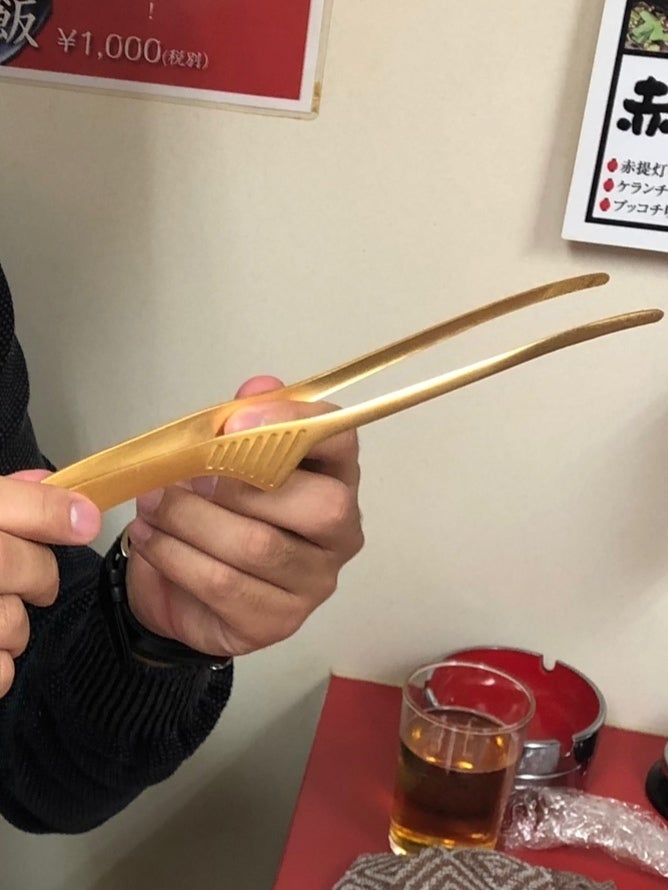 この金色のトング、凄く格好よくて、皆様に持って頂き