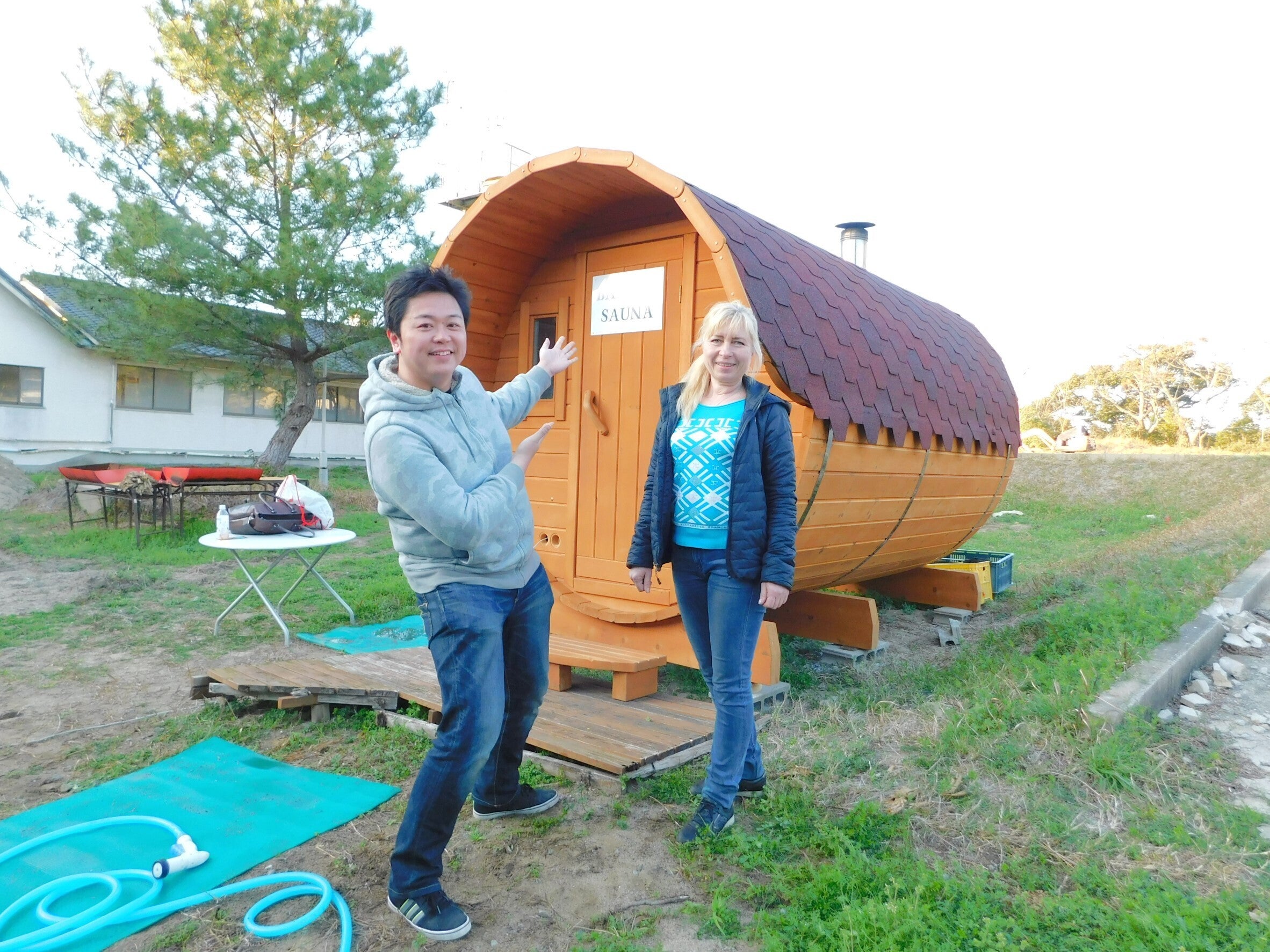 取材では、臨場感ある記事を書いていただくため、ライターの大塚さんに樽サウナを体験してもらいました。
