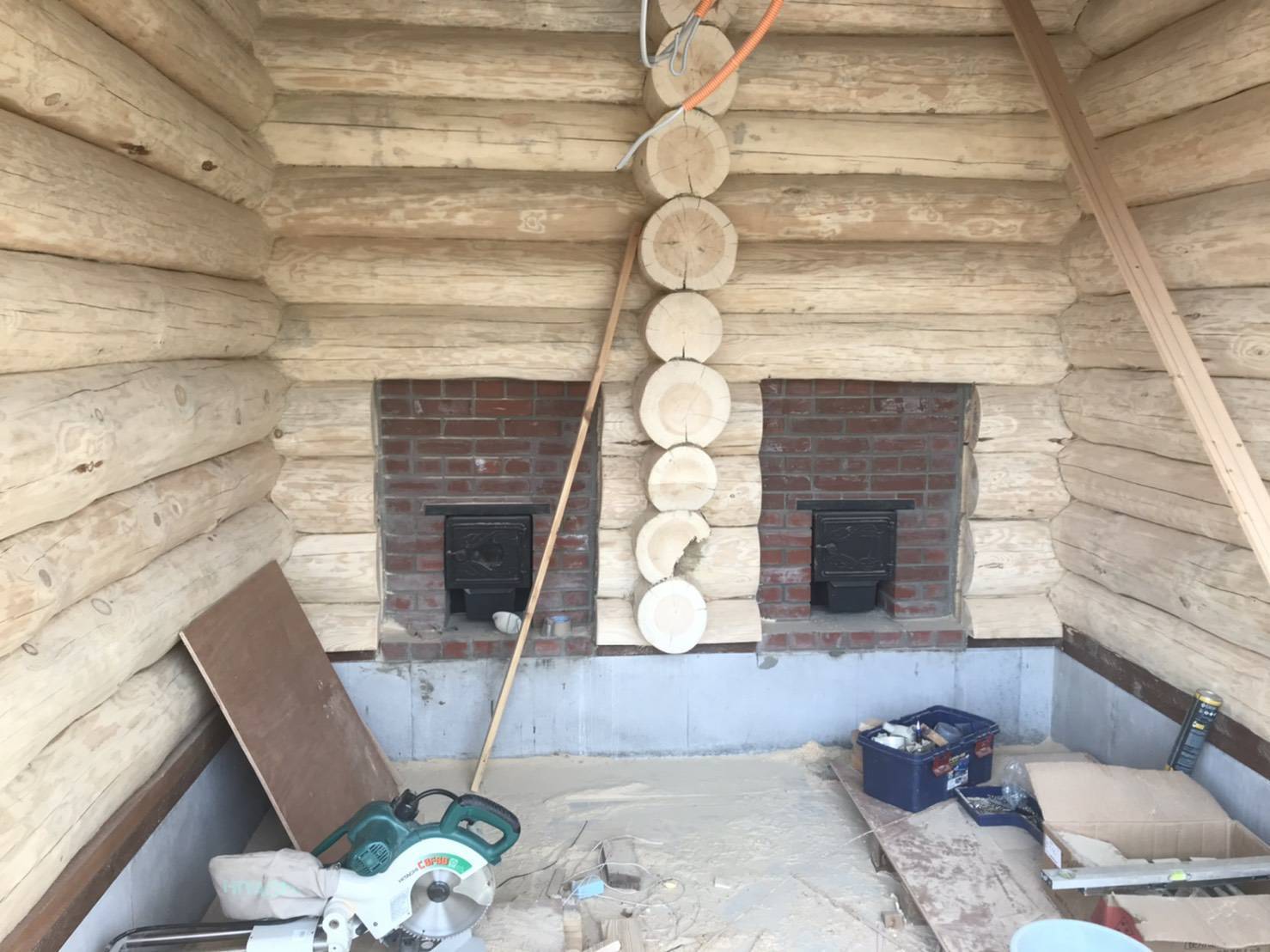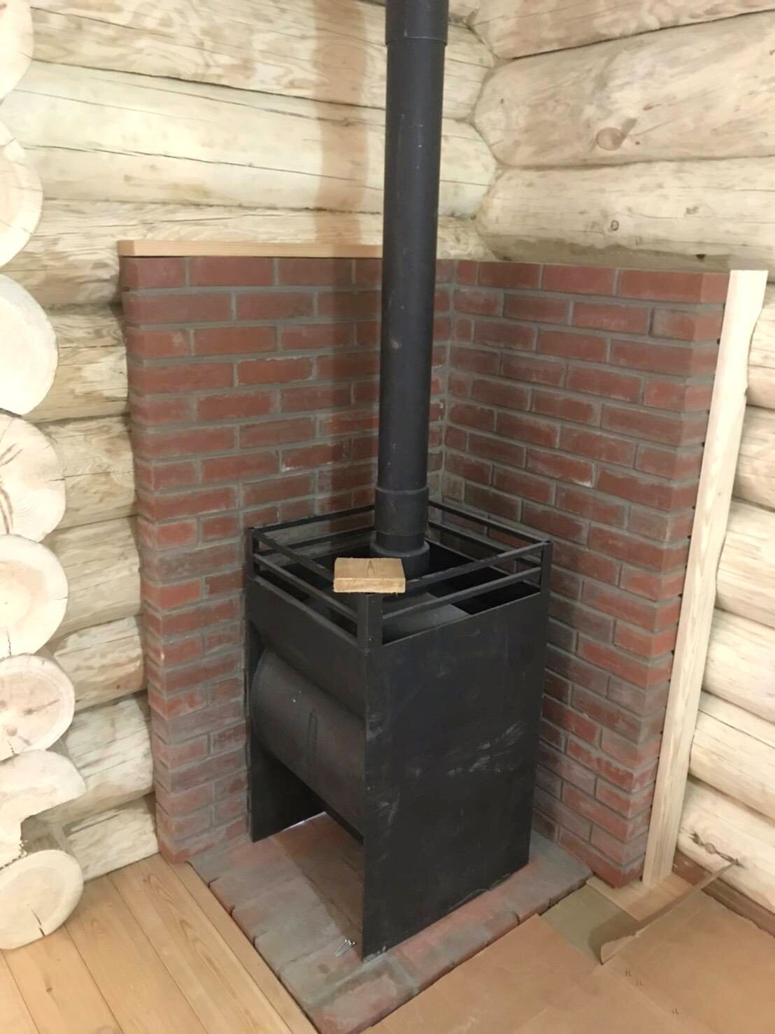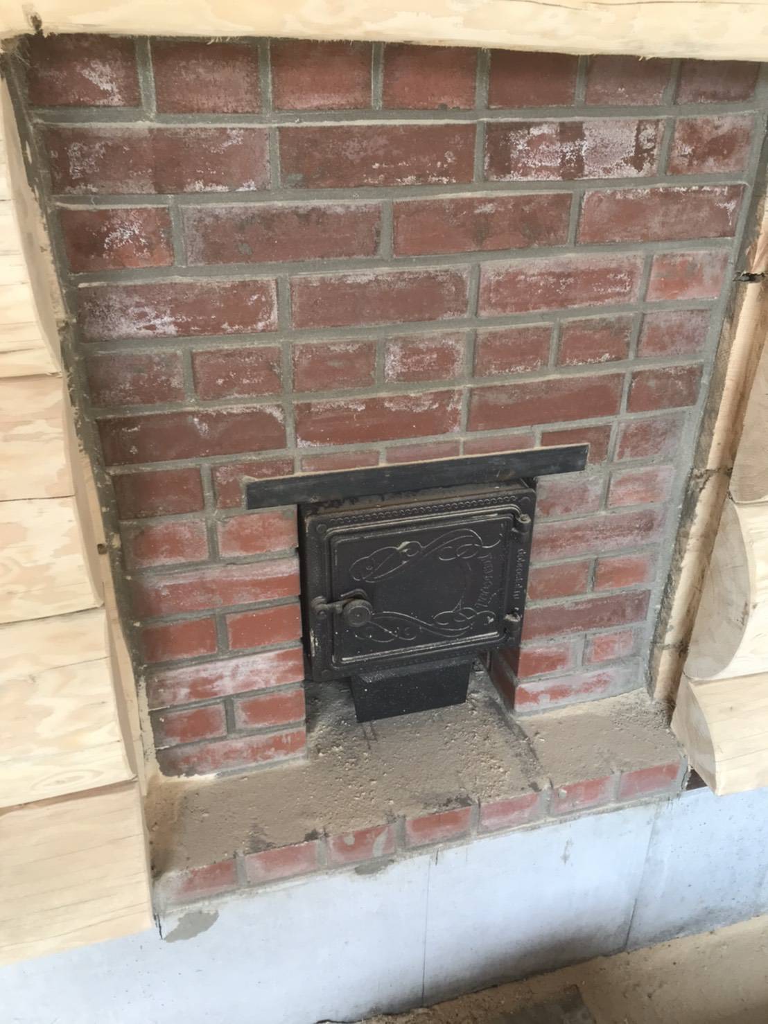 ストーブも設置しました。クラウドファンディングでも言及していた通り赤煉瓦造りのペチカを設置。薪の投入口はバーニャの外に設置しております。