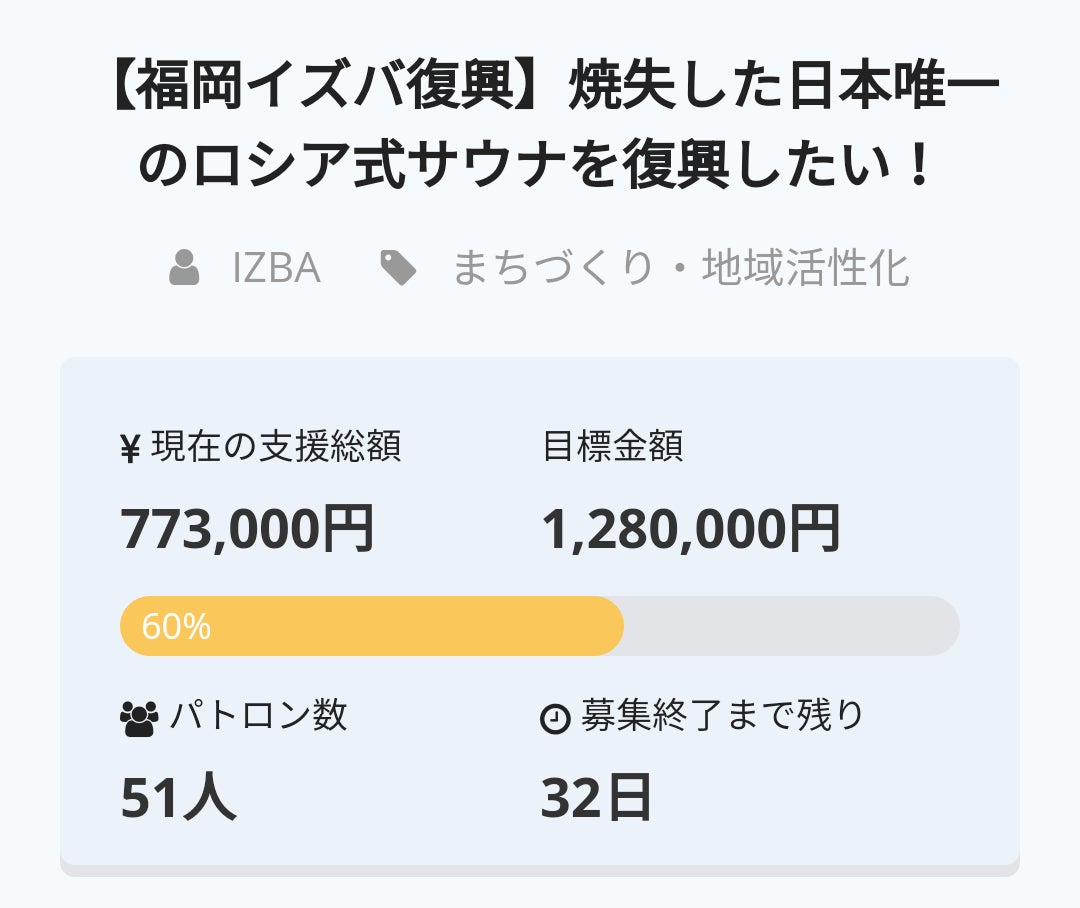 31日現在(7日経過)、51人の方から773,000円(達成率60%)の支援が集まっています。本当にありがとうございます。皆様のご期待に応えることができるように、私はバーニャ造りを頑張ります。