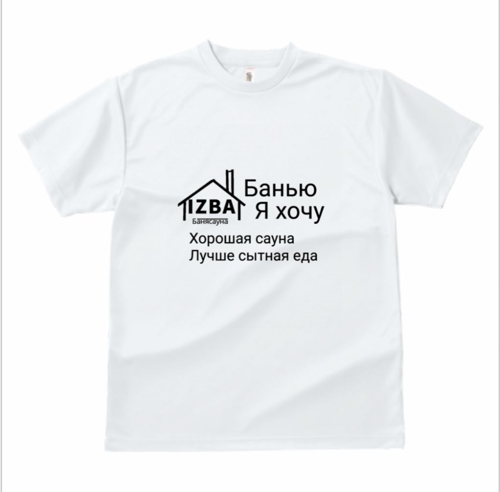 イズバロゴとロシアの諺【最高のサウナは心のこもった食事よりも良い】を前面にあしらったTシャツです。
