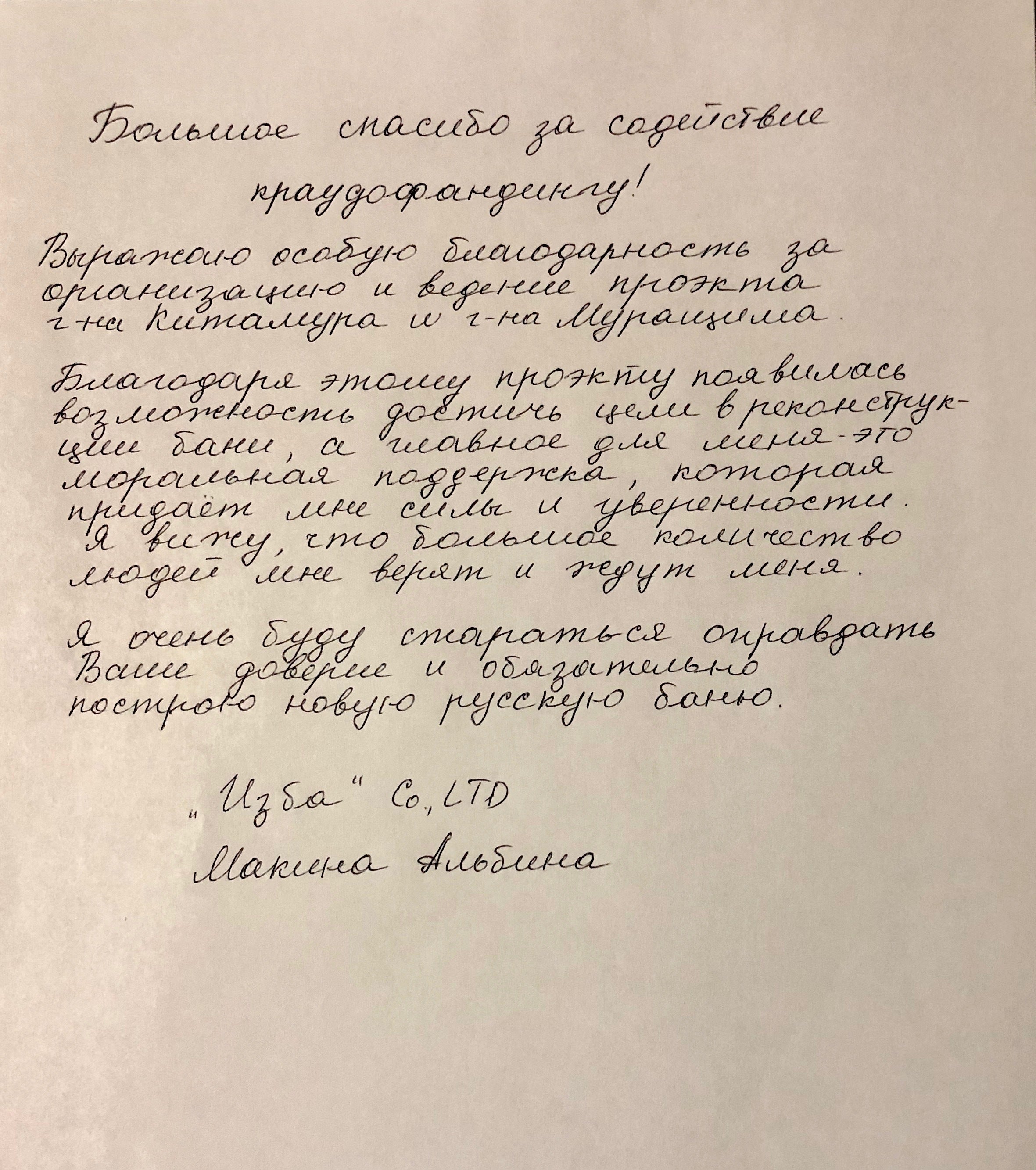 プロジェクトメンバーの北村さん、村嶋さんのサポートもあり、目標額を達成する事が出来ました。大変感謝致しております。イズバの日本唯一のロシア式サウナを早くご披露出来るよう頑張ります。