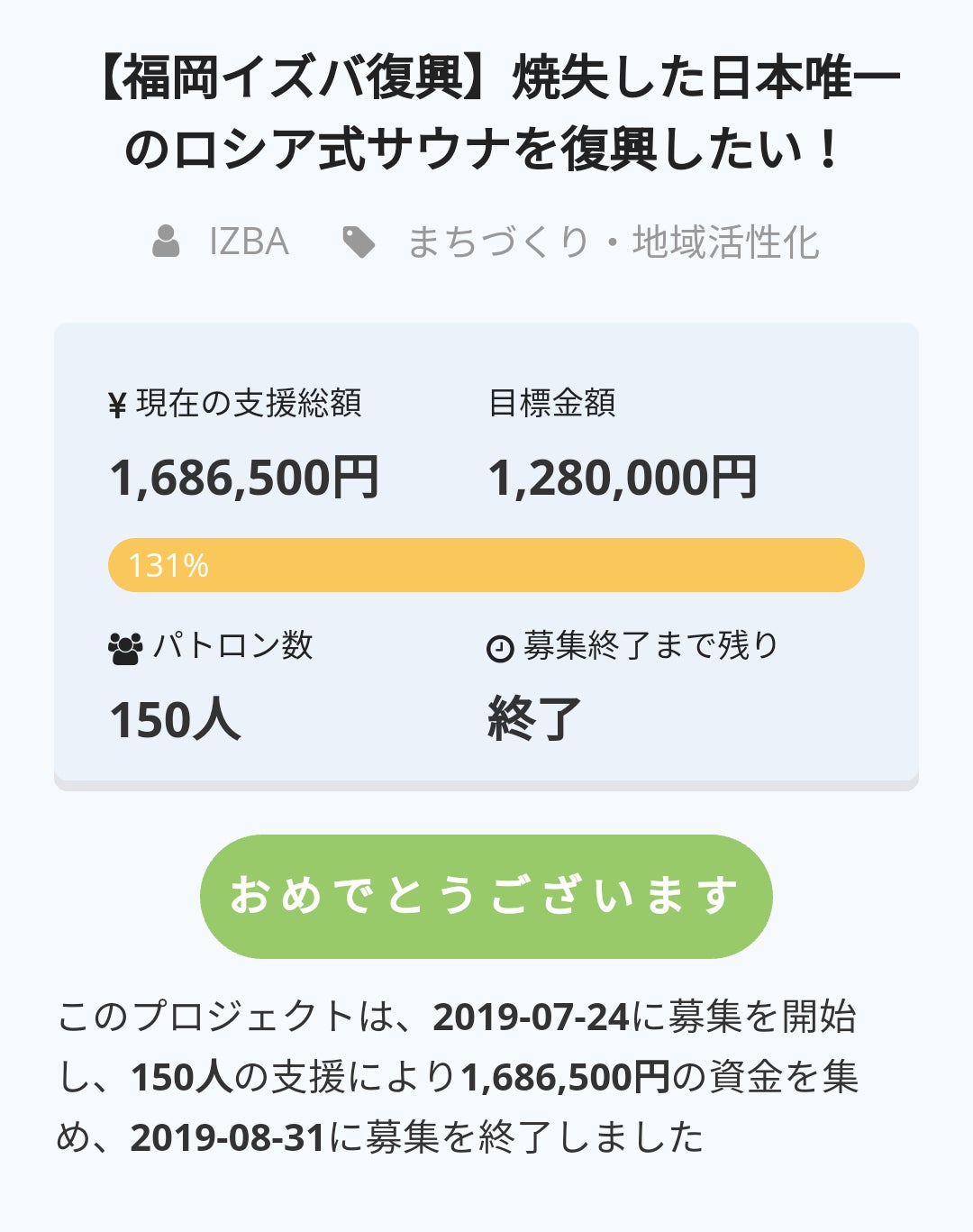 合計150人の方から多くのご支援を頂き、達成率131% 合計金額168万6500円でSUCCESS達成することができました。