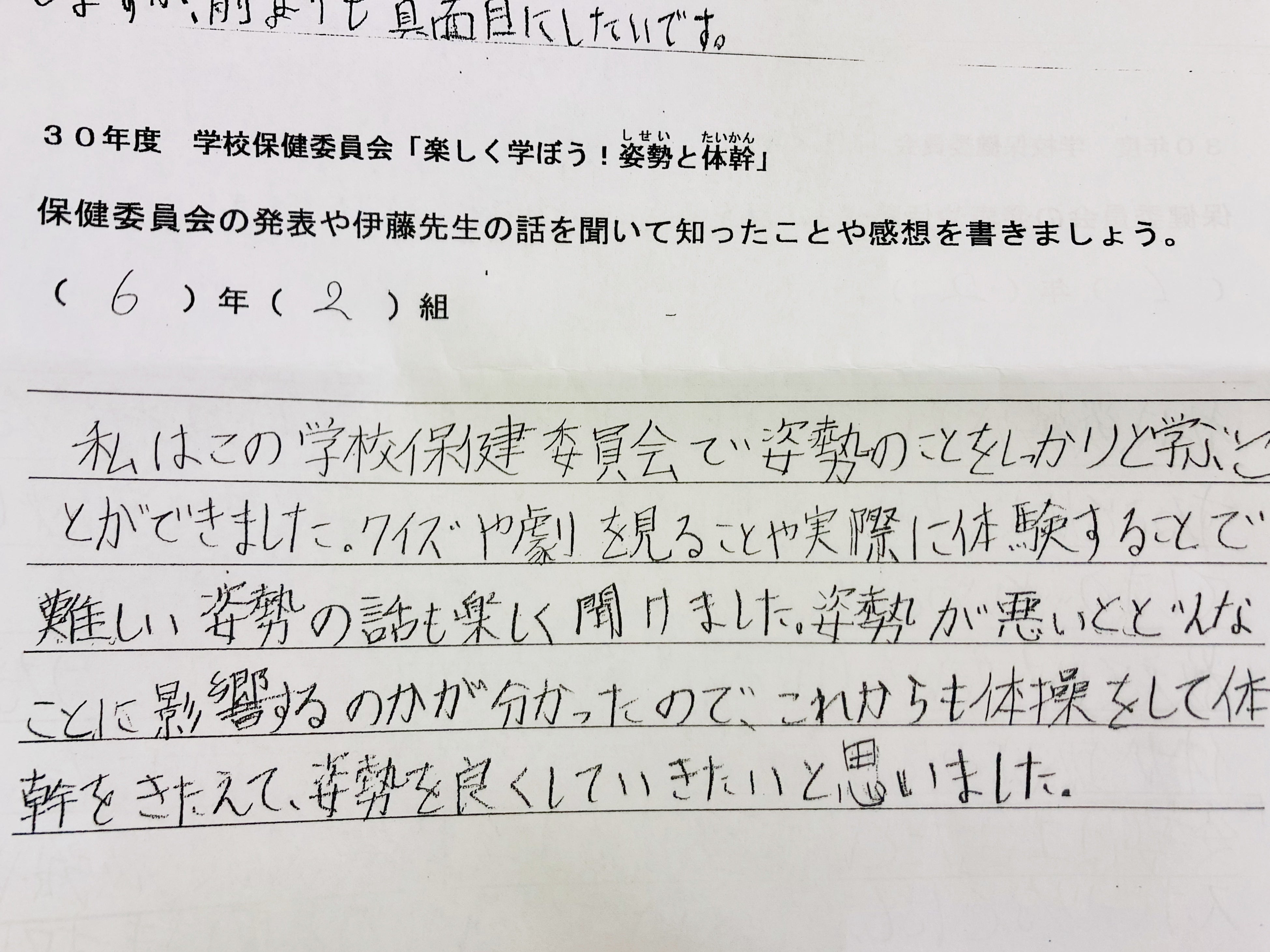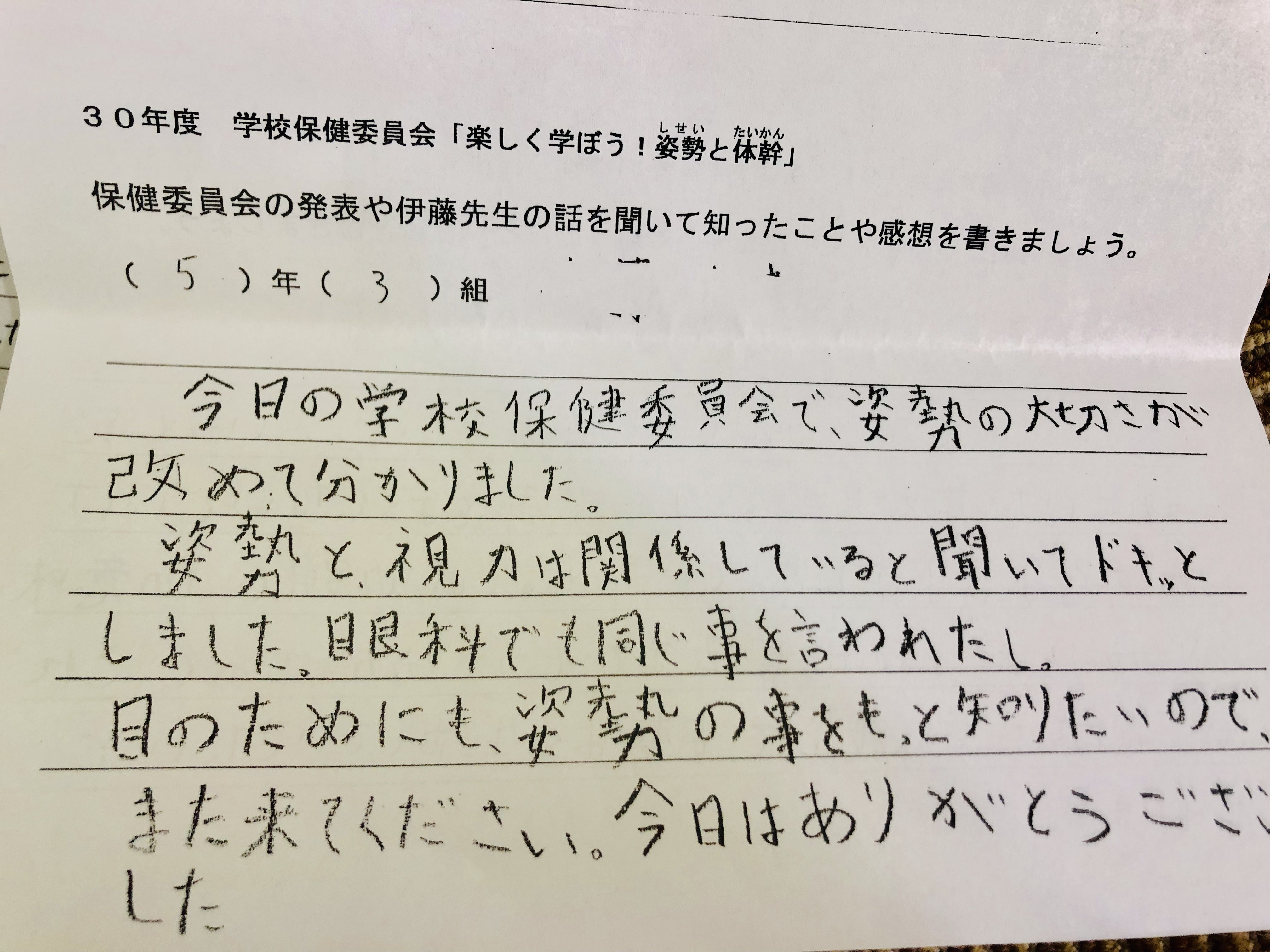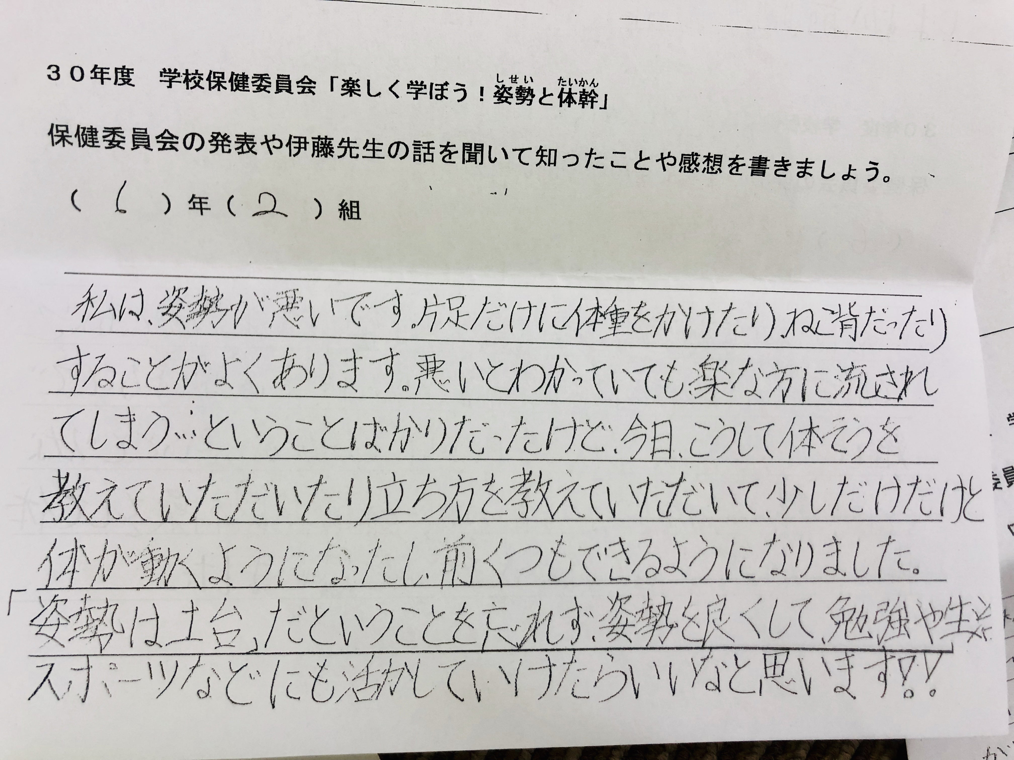 (授業で姿勢チェック)実際、教室の後ろから見ていると、多くの子供がまっすぐ座れていない。片肘をついたり、椅子に浅く座って背もたれにべったりもたれていたり、机の上に上半身を預けるようにしている子が目立つ。前から見ると椅子の足に自分の足を引っ掛けて座ってる子も多く、机と頭の位置が近い。横から見ると見事な猫背の集団が目の前にいるのです。姿勢が悪いのはわかった。でもそれだけが原因じゃないように感じ、先生だけでなく、児童や保護者、児童を取り巻く環境も知る必要性があったので年間通じて関わらせて頂くことに。
