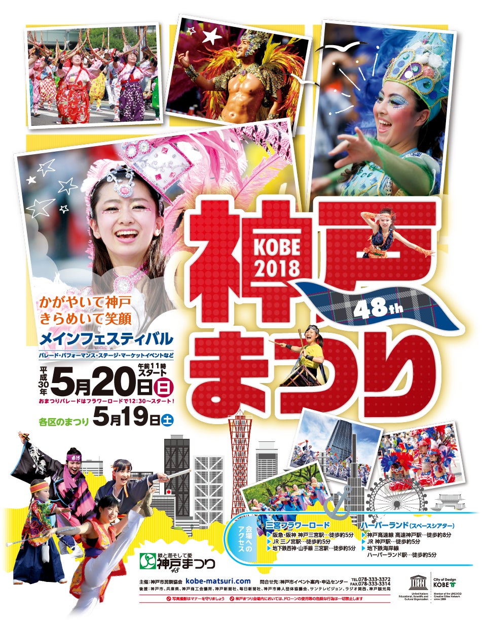 神戸まつりとは、神戸市の財政援助団体である神戸市民祭協会が主催し、1971年に市民参加型の画期的な祭りとして誕生した。兵庫県神戸市の中央区三宮を主会場に、市内各地で実施されている兵庫県最大の祭典である。テーマは「緑と海そして愛」。出典ウィキペディア