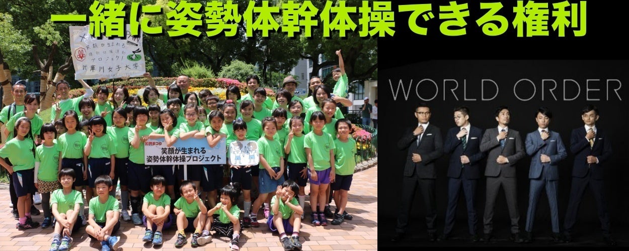 著作権の問題など色々難しいご時世。笑顔が生まれる姿勢体幹体操の主題歌(BGM)でもある『WORLD ORDER』にも勿論、著作権があります。しかしWORLD ORDERさんの事務所に確認を取らせてもらうと「学校現場や公共のイベントで使用してもらっても構いません」と太っ腹な回答をいただきました。そんな粋なWORLD ORDERのパフォーマンスを間近で見たい!そして厚かましくも「姿勢体幹体操を一緒にやってくれませんか?」と問い合わせた所、な、なんとOKをいただきました!!(驚)