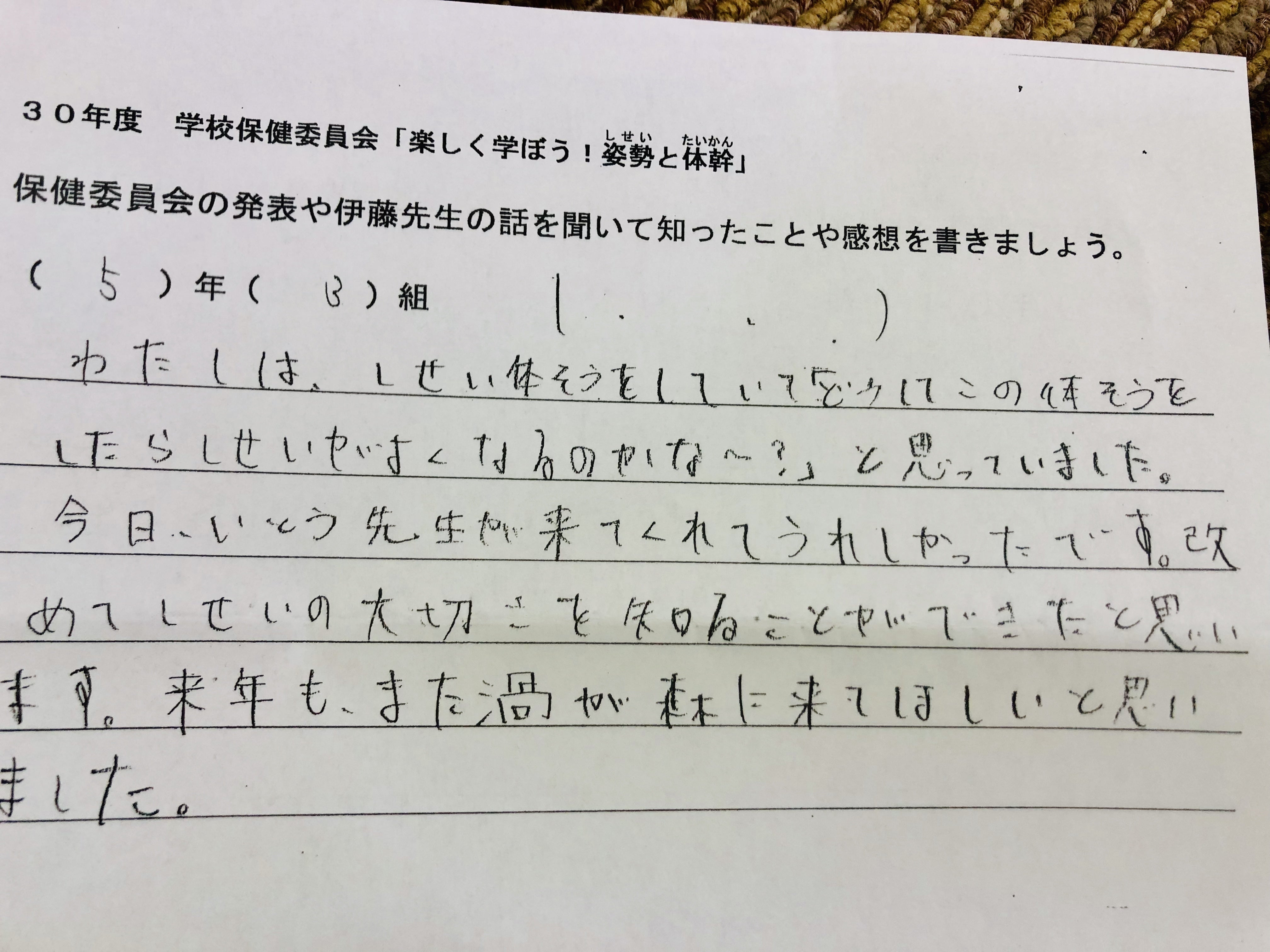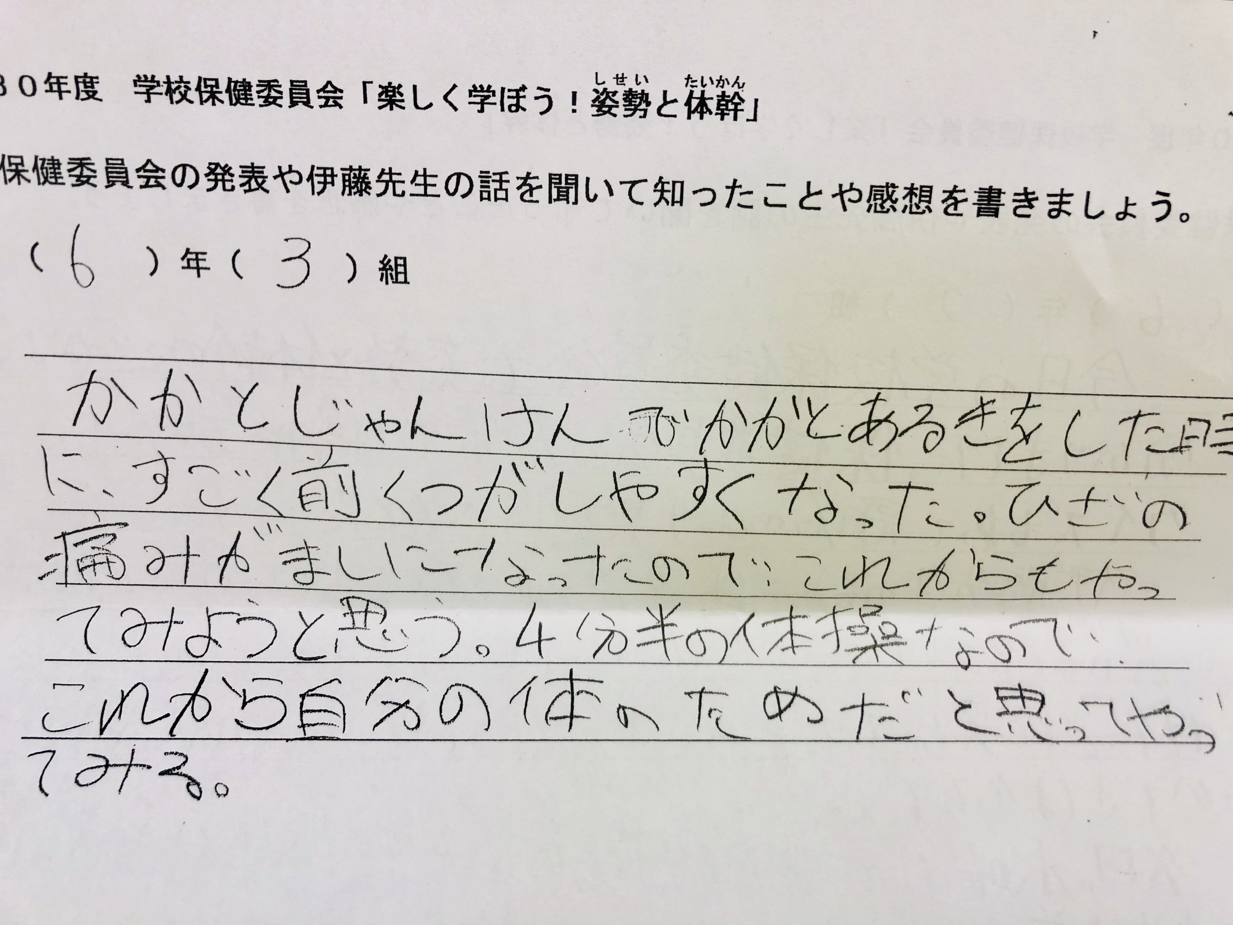 (授業で姿勢チェック)実際、教室の後ろから見ていると、多くの子供がまっすぐ座れていない。片肘をついたり、椅子に浅く座って背もたれにべったりもたれていたり、机の上に上半身を預けるようにしている子が目立つ。前から見ると椅子の足に自分の足を引っ掛けて座ってる子も多く、机と頭の位置が近い。横から見ると見事な猫背の集団が目の前にいるのです。姿勢が悪いのはわかった。でもそれだけが原因じゃないように感じ、先生だけでなく、児童や保護者、児童を取り巻く環境も知る必要性があったので年間通じて関わらせて頂くことに。