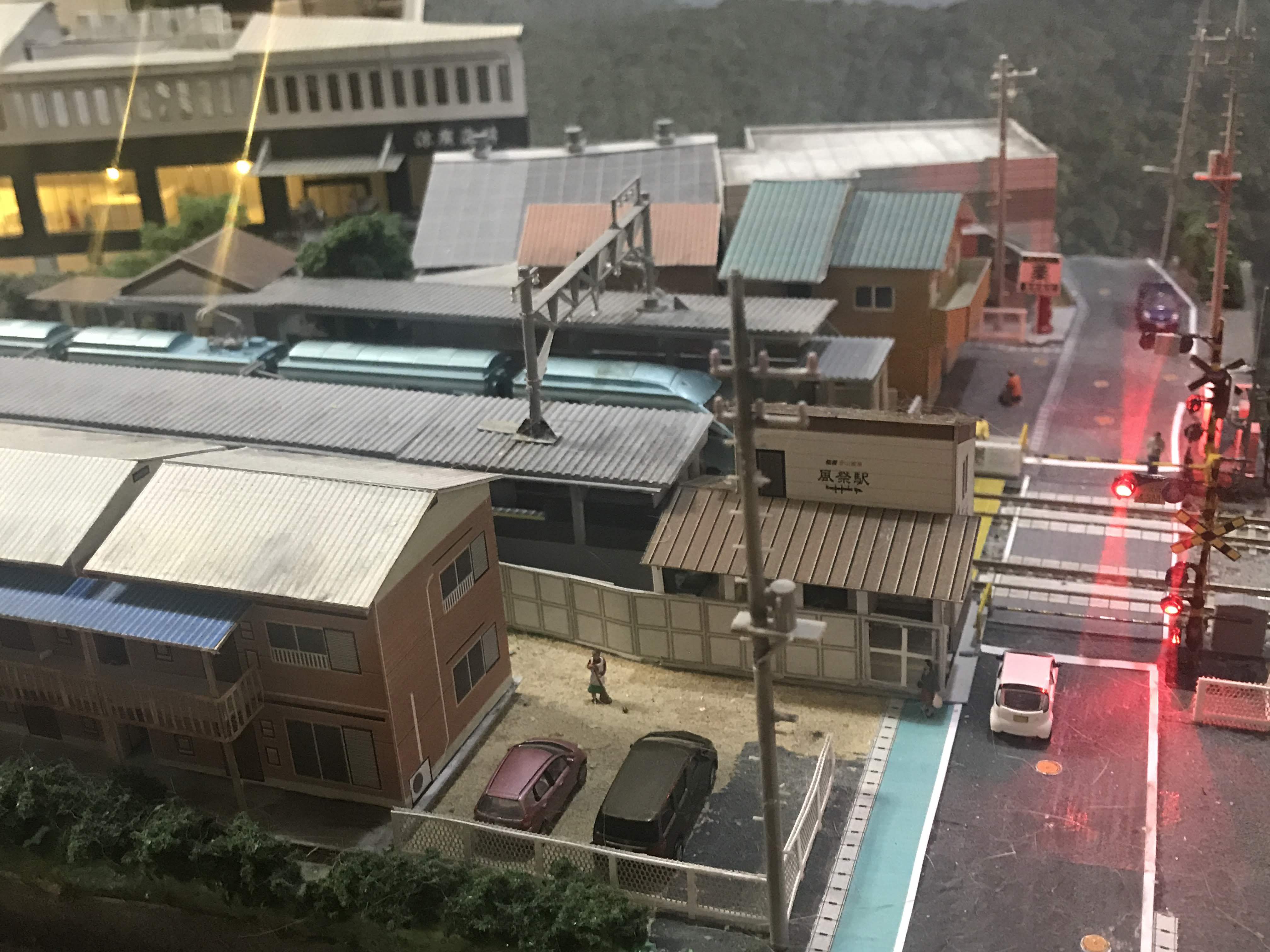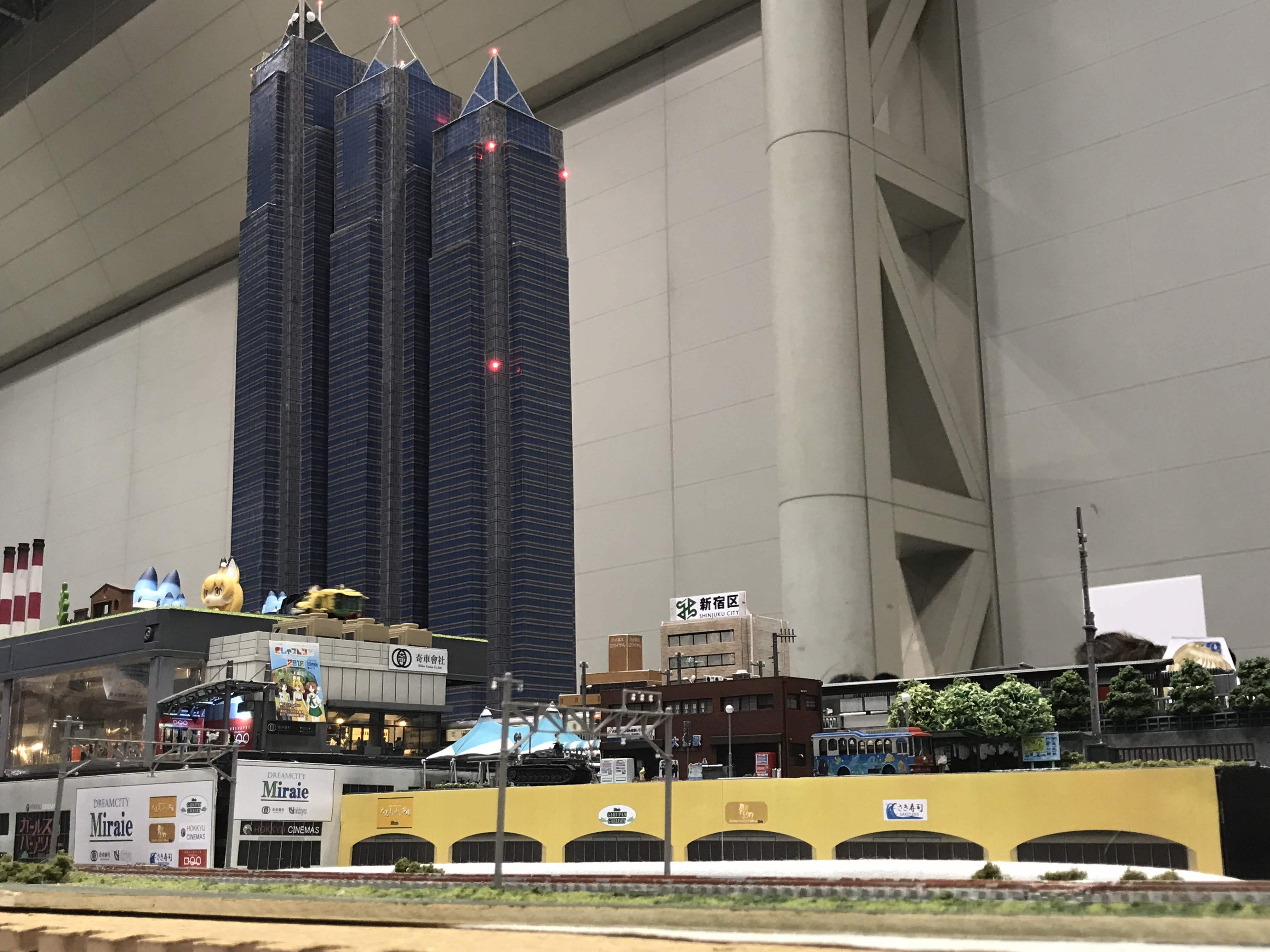 展示に置いて夢あふれる建築物の存在が、走る鉄道模型を何倍にも素敵に見せます。奥の高いビルを含め、殆どの建物が自作、フルスクラッチです。製品をただ並べるよりも格段に夢あふれる展示にできたと自負しております。