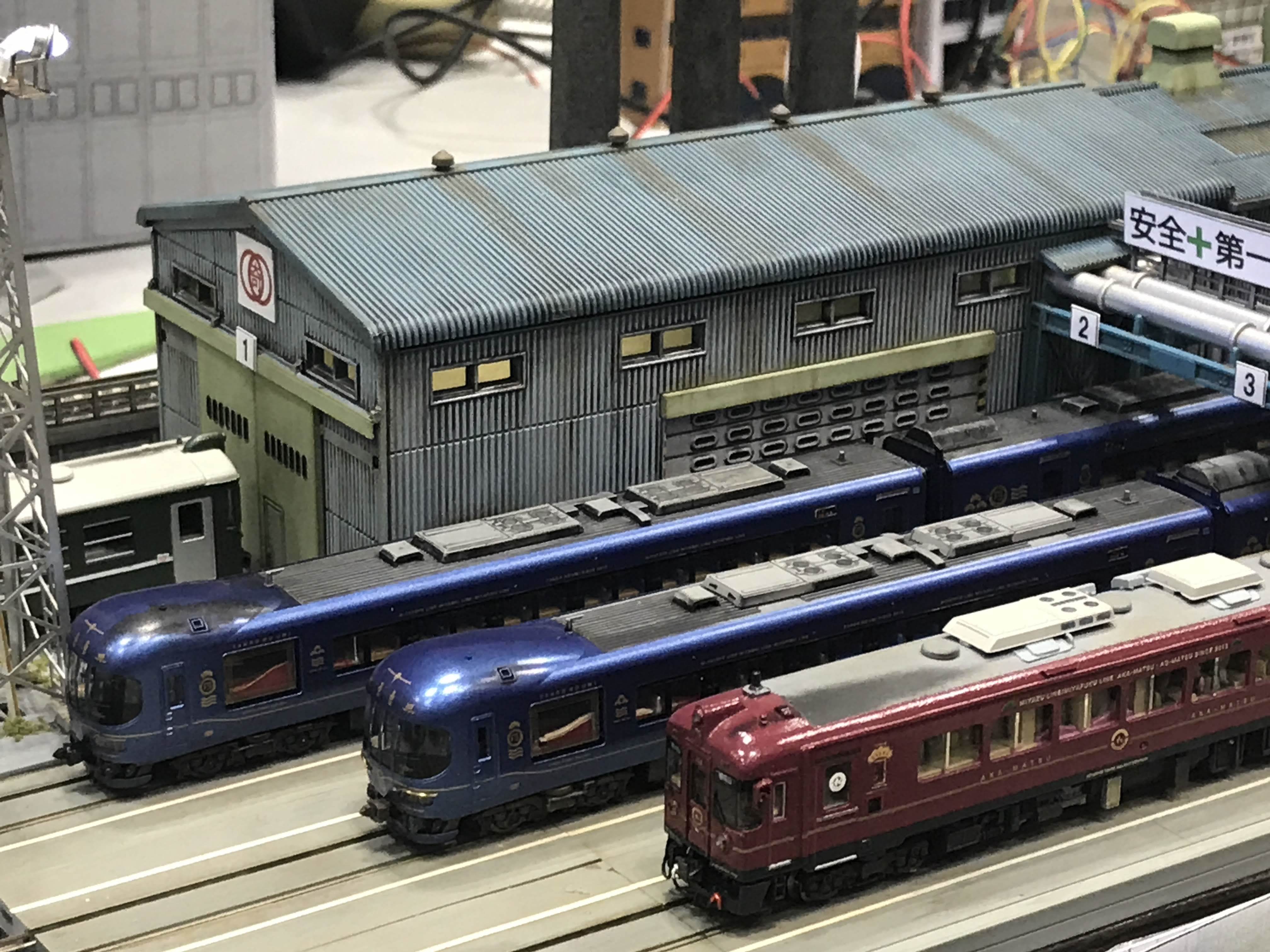車両工場はキットのものを重改造して実感的に。手前の車両は既成品を綿密な調査で徹底的に実感的に仕上げました。また手前の赤い車両はフルスクラッチで、鉄道模型誌にも数ページに渡って掲載されたものです。しかし資金難でせっかくのこの車両のお披露目の機会がなくなろうとしています。
