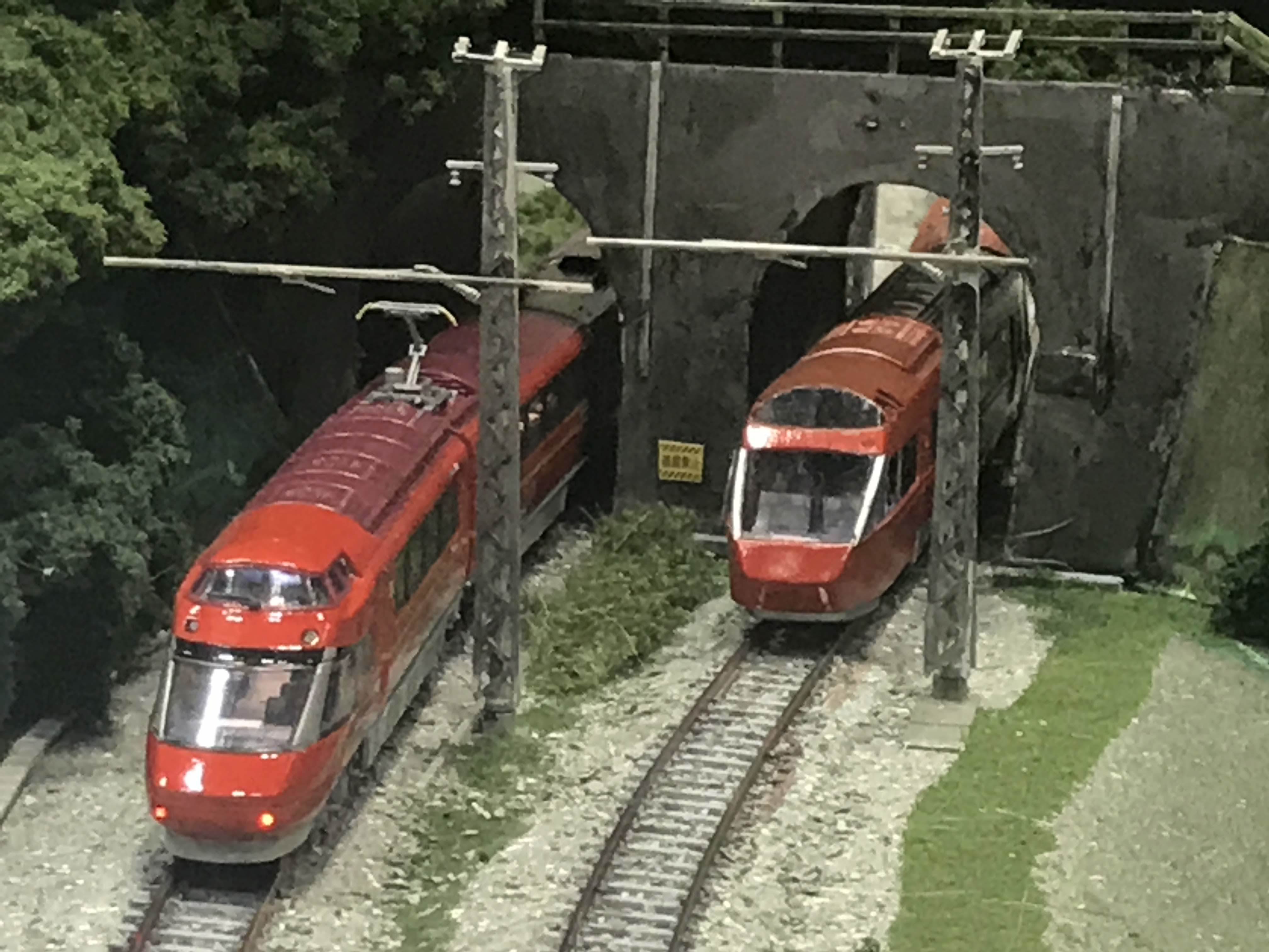 この2編成の赤い車両は左側は架空の夢のロマンスカー。実在しませんが徹底的に実感的に作り込んでいます。右は実在ながら当時メーカーも出していなかった新鋭車両です。正式なデビュー発表から2週間程度でフルスクラッチ模型としてつくったもの。どちらも我々の友人です。