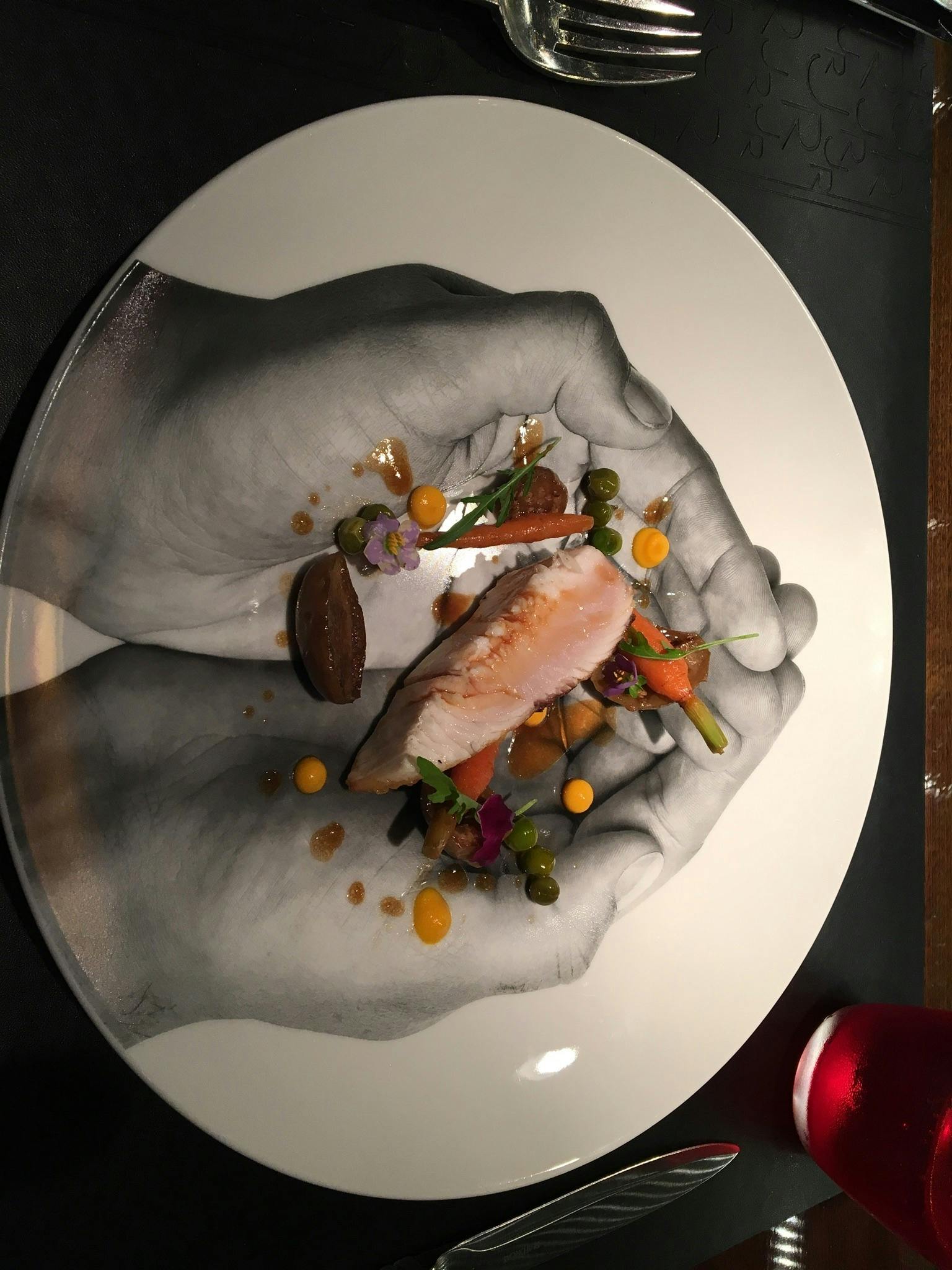 手のデザインのお皿は、その時シェフが