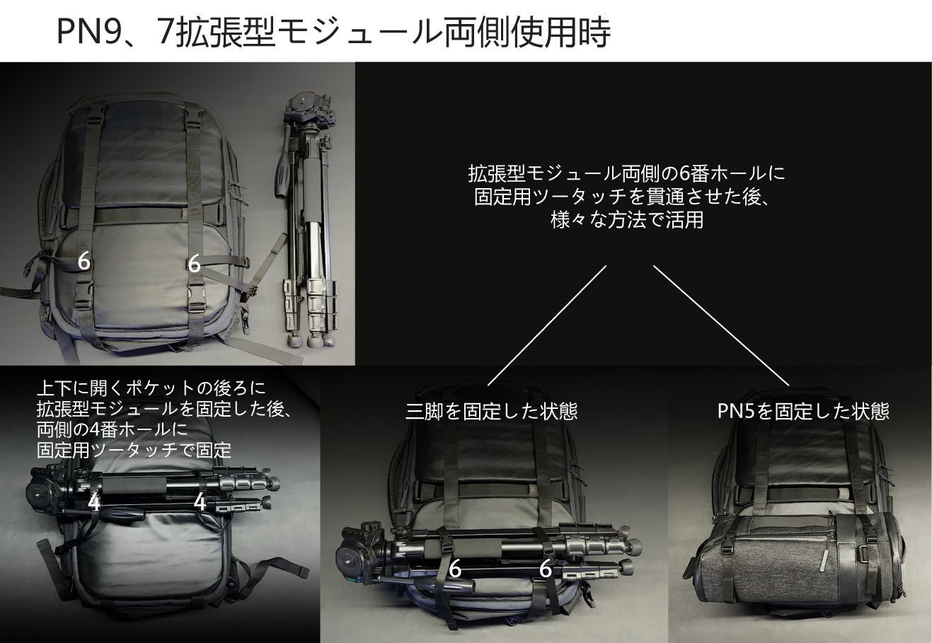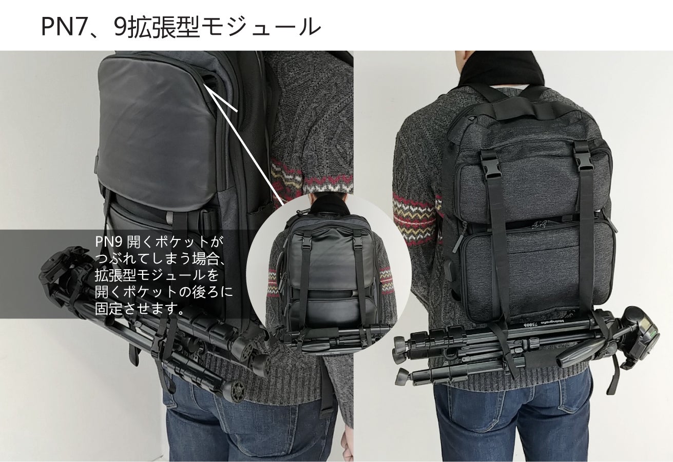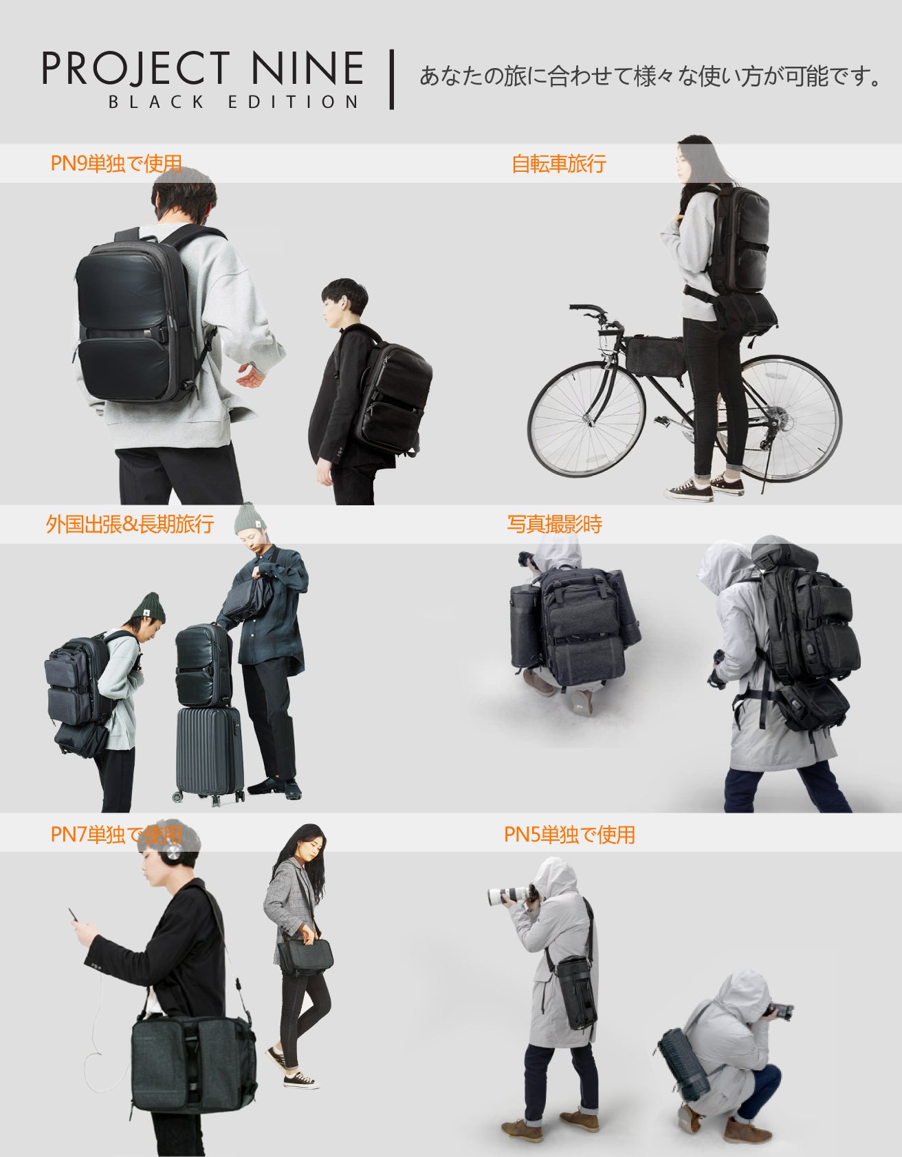 PN9:「PROJECT NINE」(PN)のすべてのバッグを入れることができ、旅行時の容量拡張や肩ベルトの収納など、様々な機能があります。